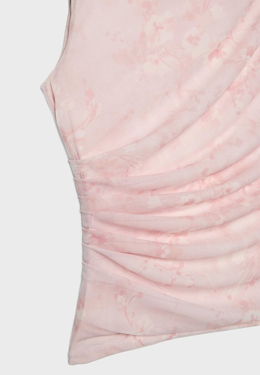 T-shirt en tulle avec doublure intérieure. Col rond et sans manches. Détail en tissu drapé. Disponible dans une gamme de couleurs.