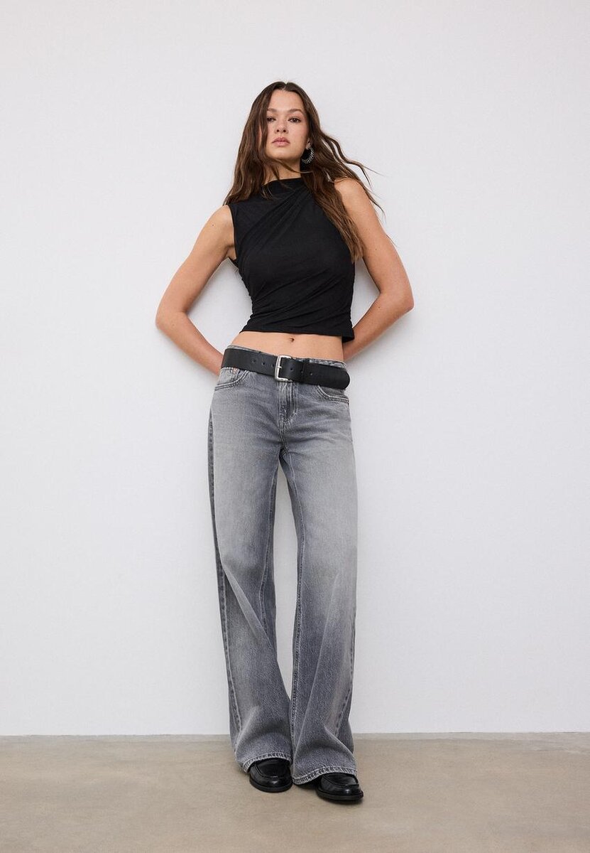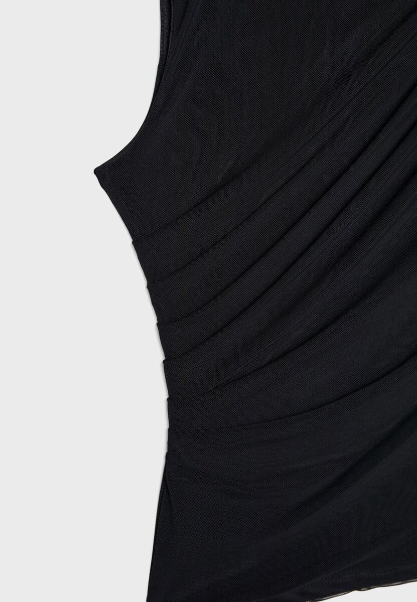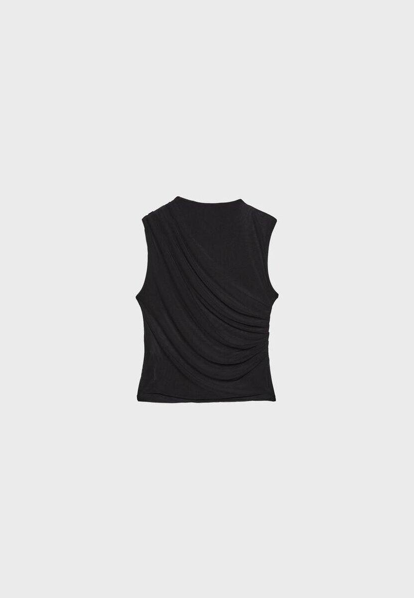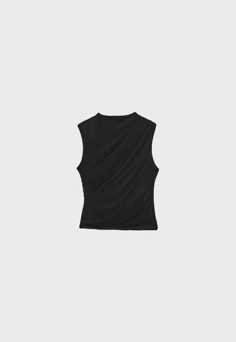 T-shirt en tulle avec doublure intérieure. Col rond et sans manches. Détail en tissu drapé. Disponible dans une gamme de couleurs.