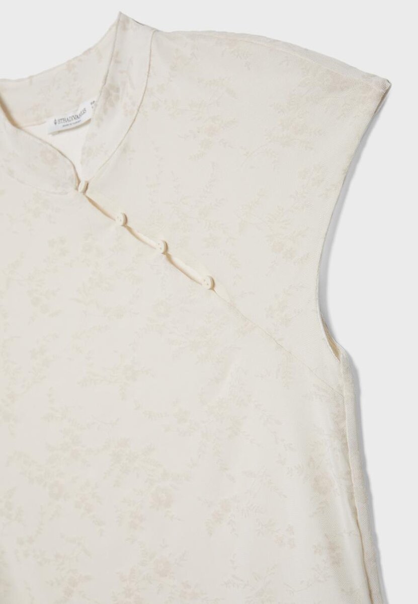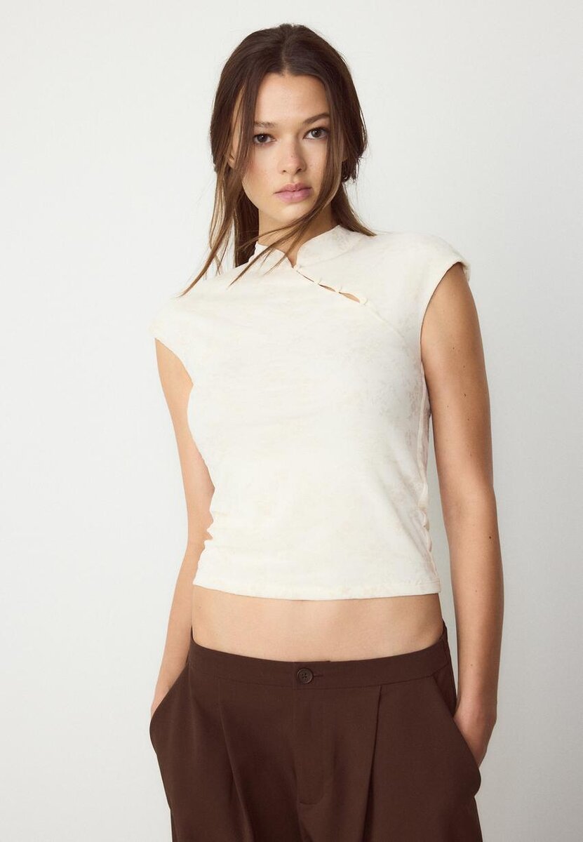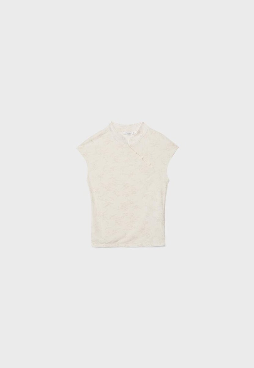T-shirt style qipao à col montant et mini-manches courtes, confectionné en tissu floqué. Orné de boutons sur le devant. Disponible en plusieurs couleurs.