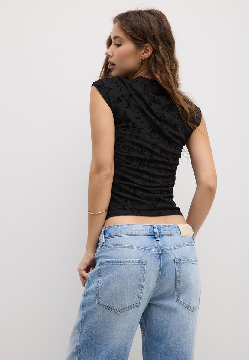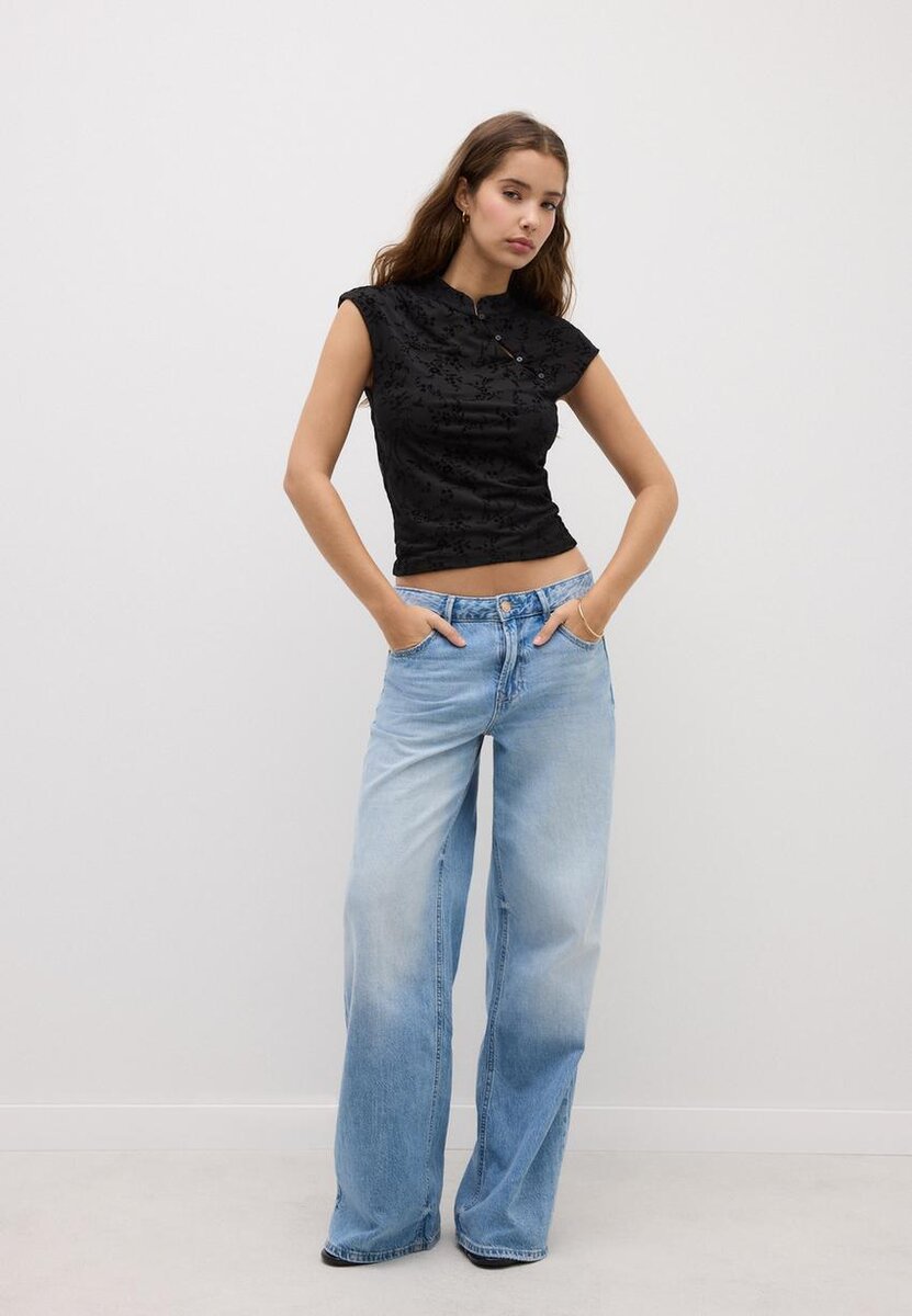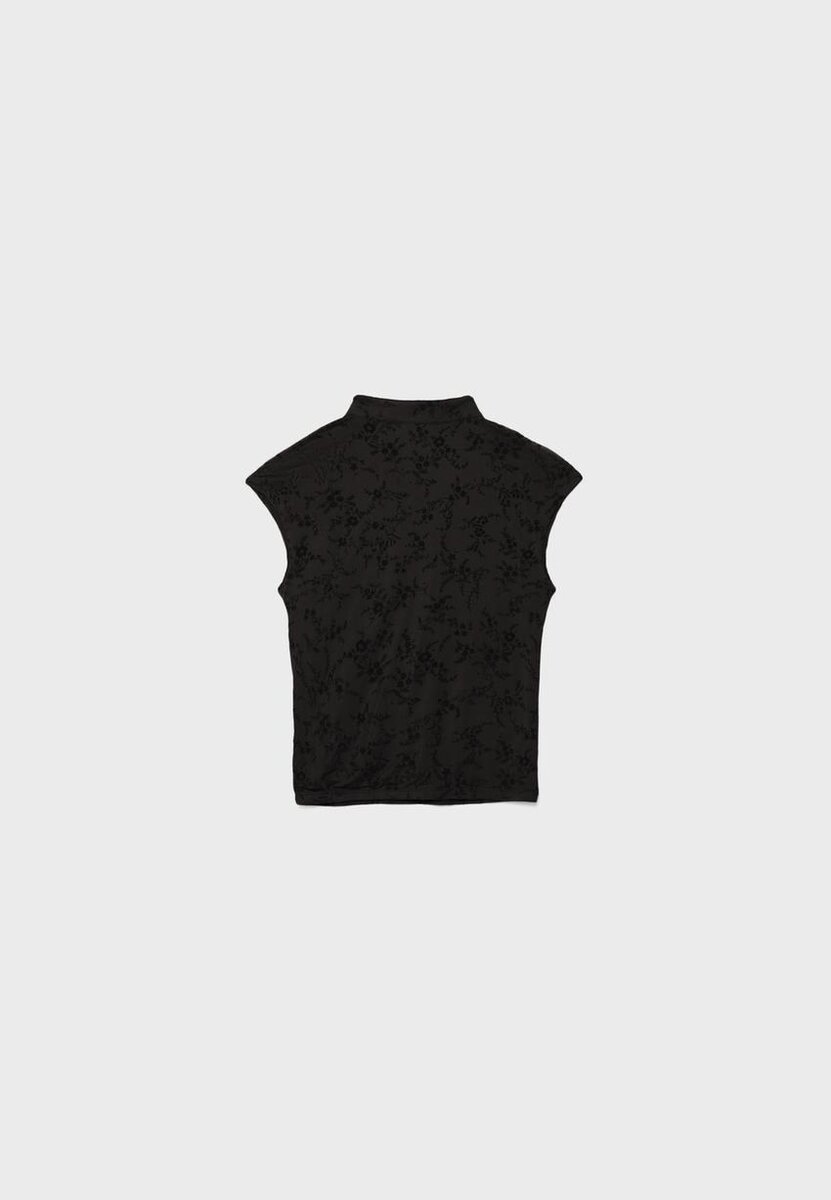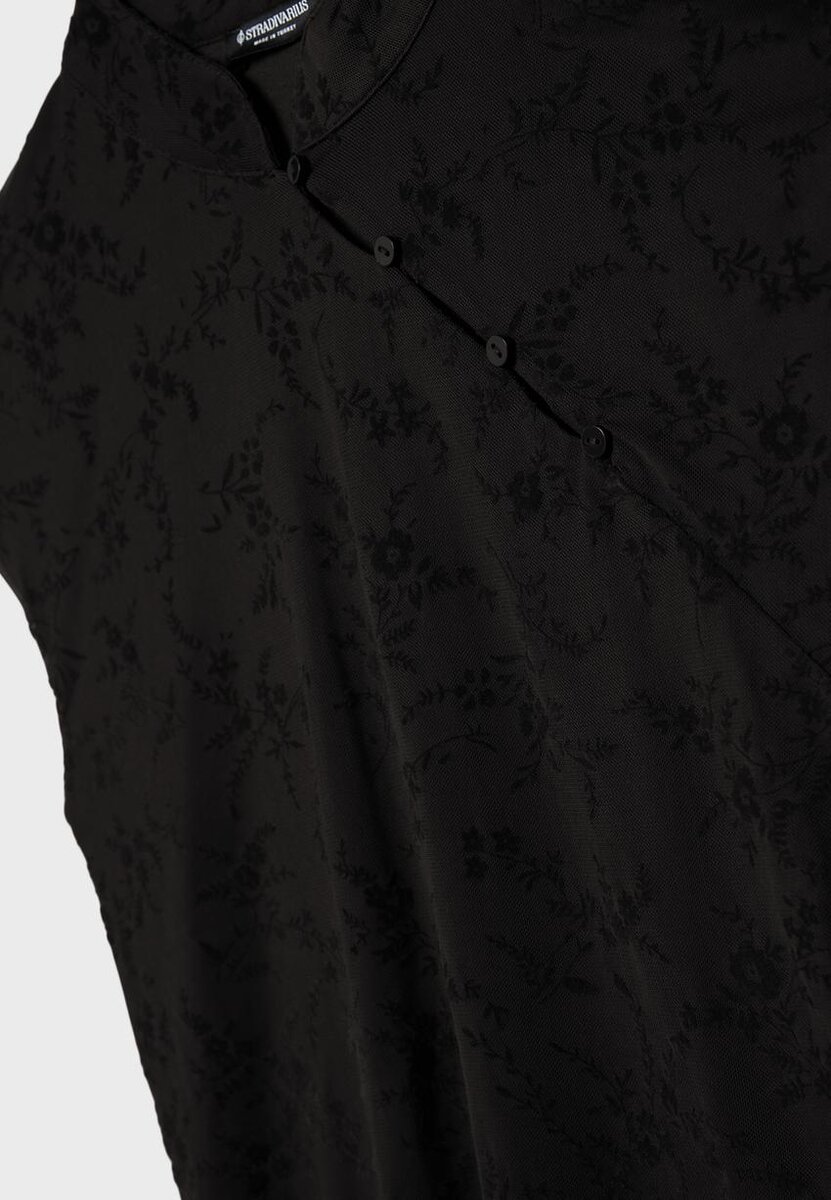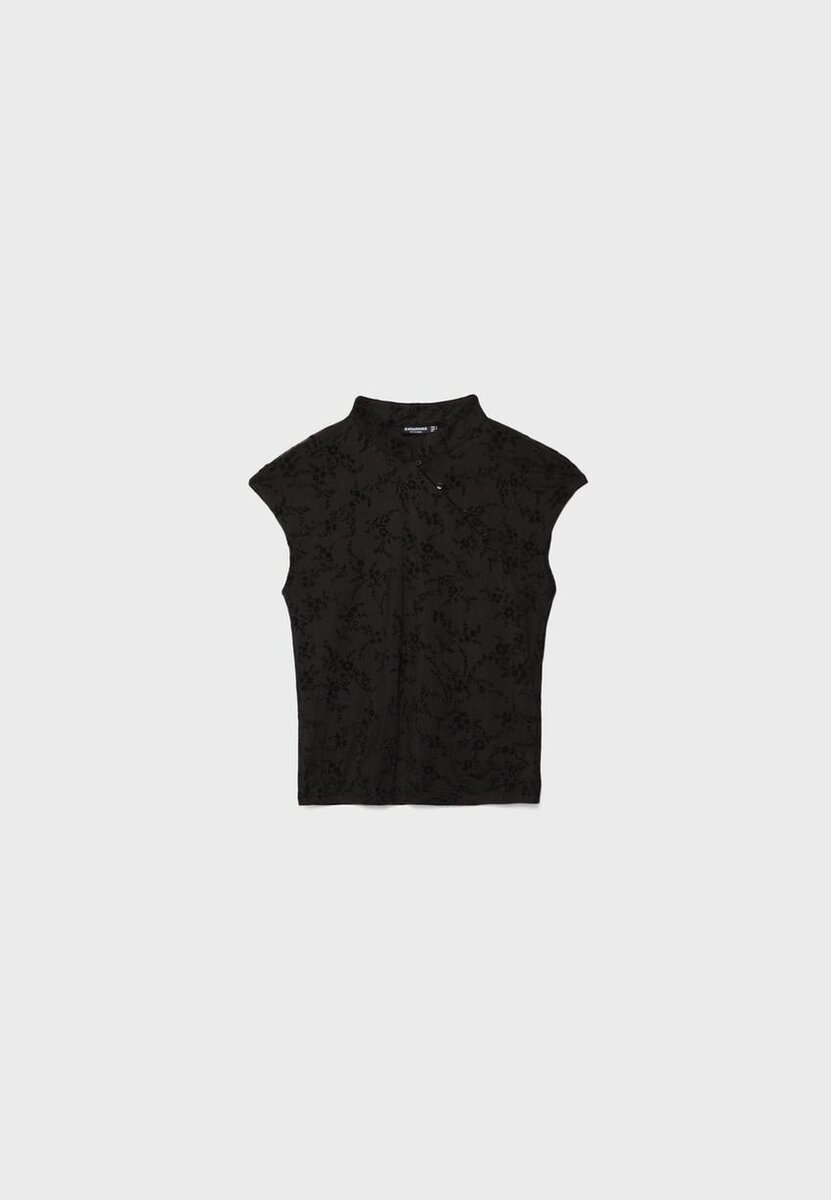 T-shirt style qipao avec col montant et mini-manches courtes, confectionné en tissu floqué. Orné de boutons sur le devant. Disponible en plusieurs couleurs.