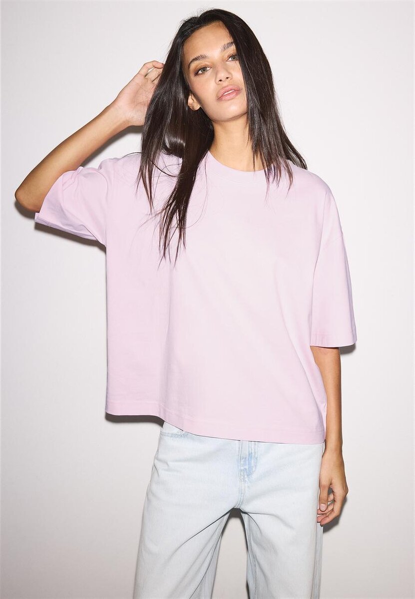 T-shirt basique à coupe oversize. Col rond et manches courtes. Disponible en plusieurs couleurs.