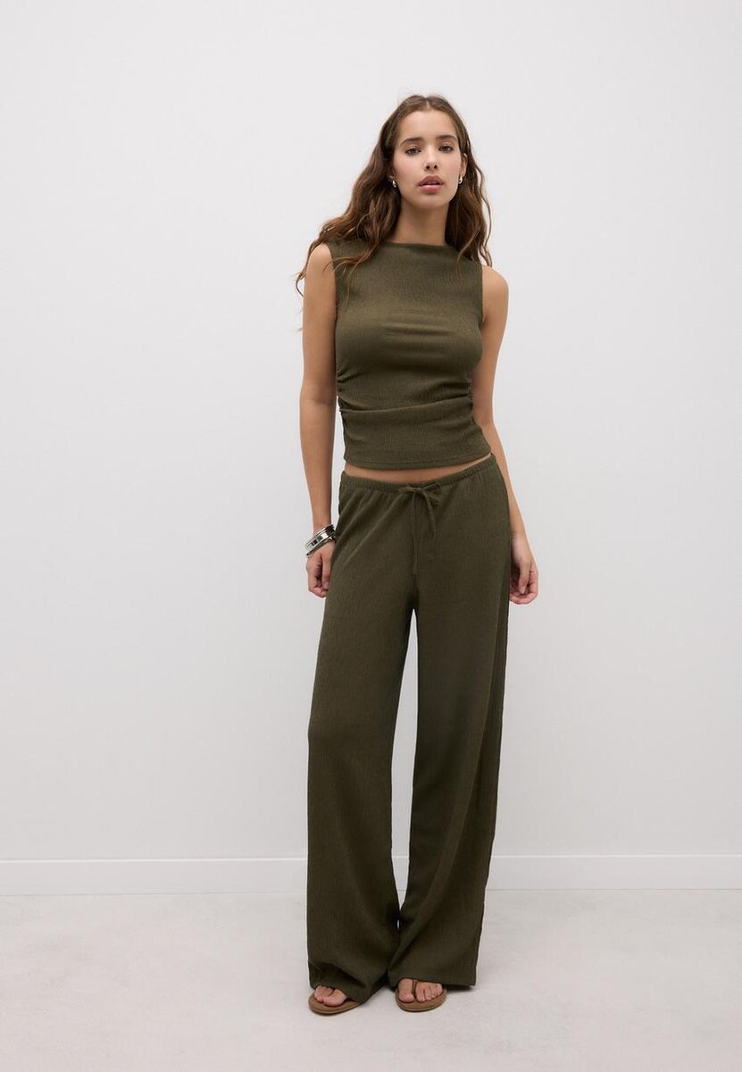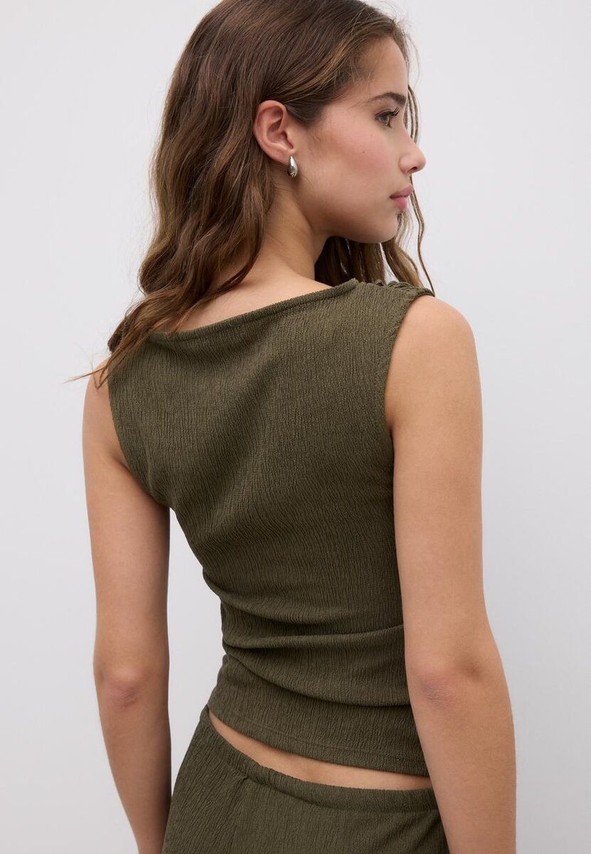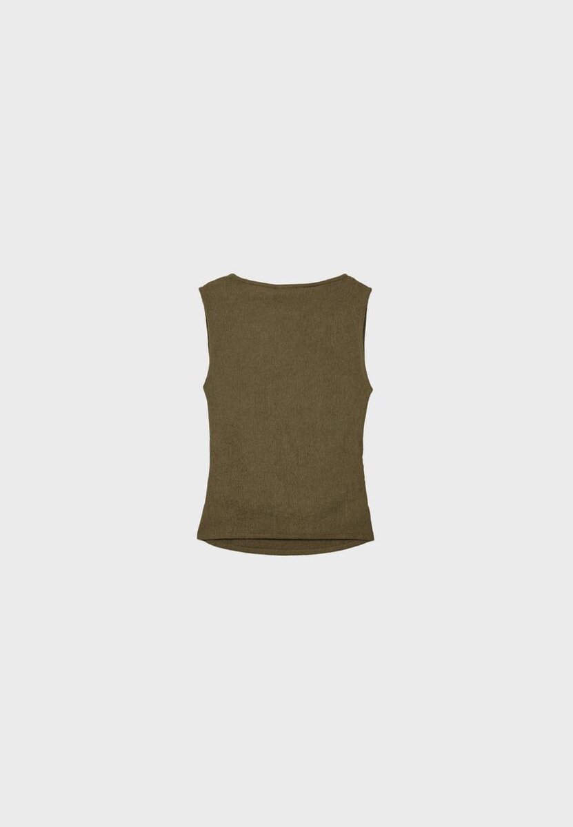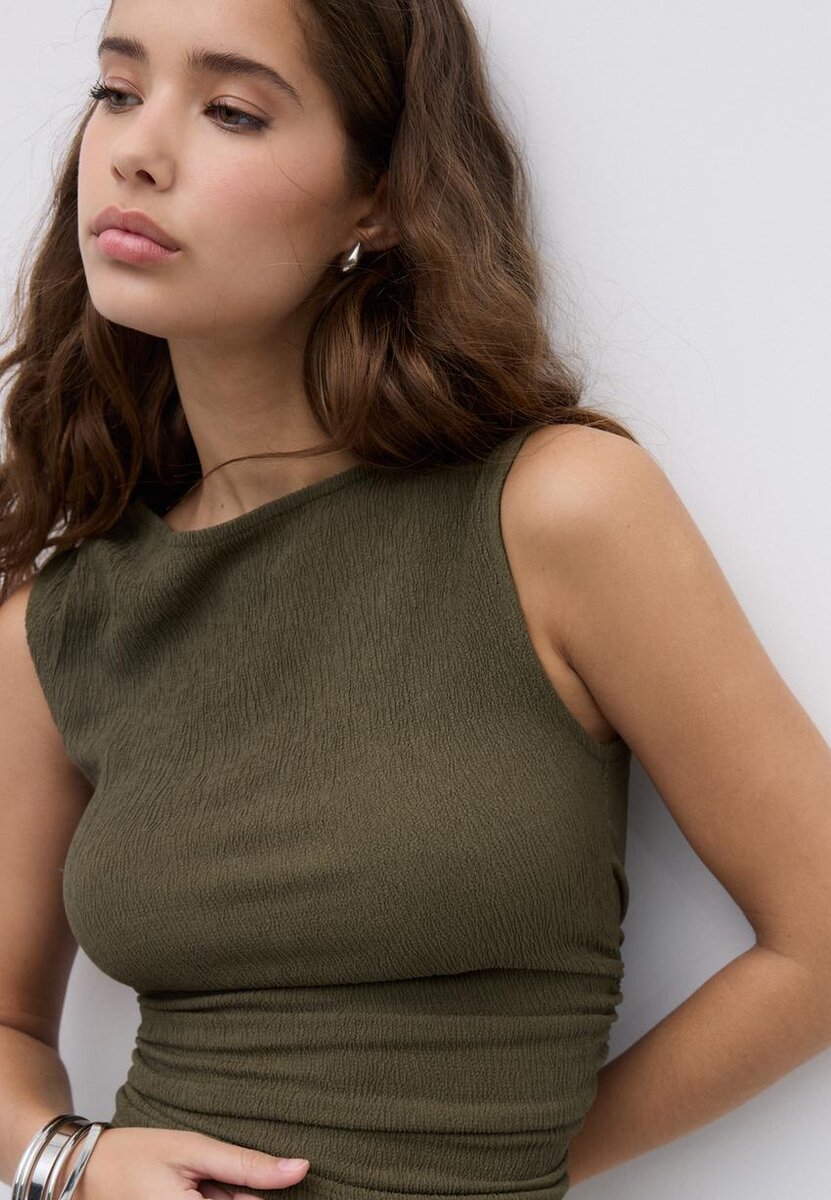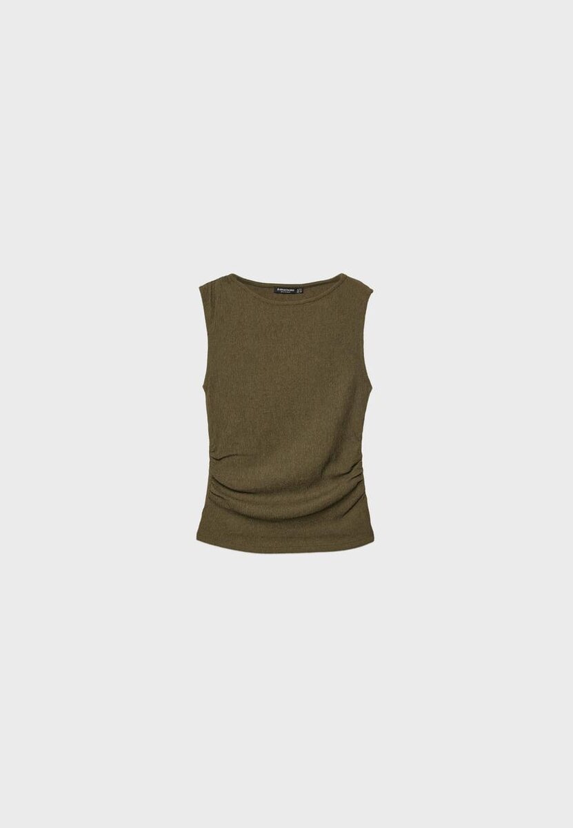 Haut texturé contenant 19 % de viscose. Col bateau et coupe sans manches. Fronces sur les côtés. Ourlet droit.