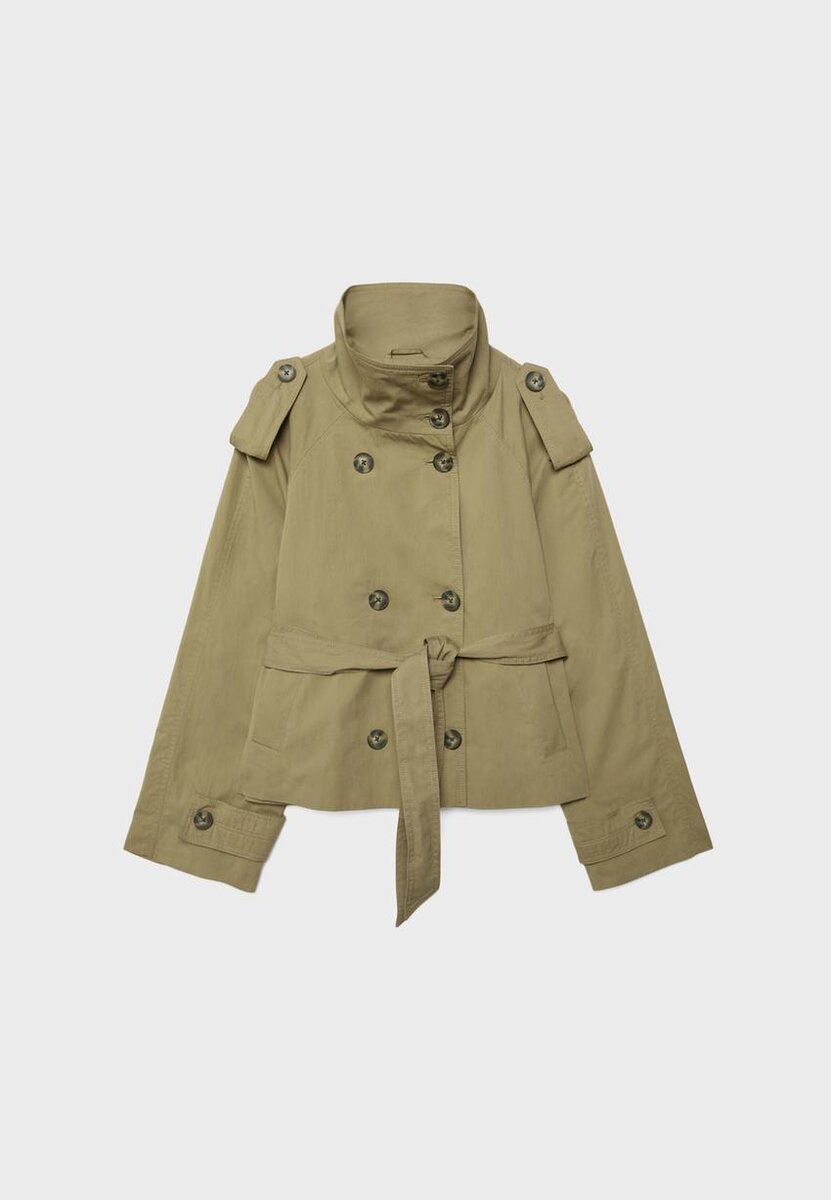 Trench-coat court à col montant, manches longues et pattes boutonnées. Poches latérales. Fermeture à double boutonnage sur le devant et ceinture assortie. Disponible en plusieurs couleurs.