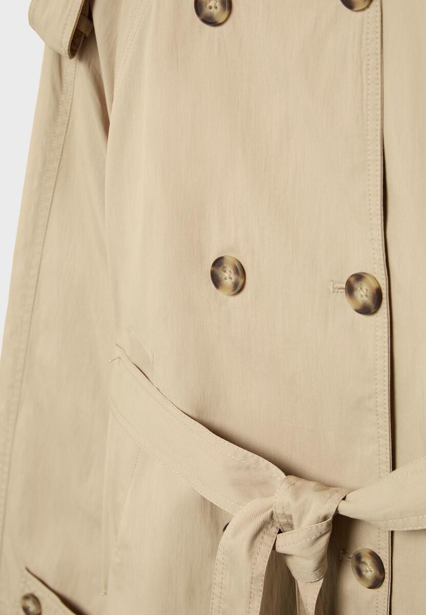 Trench-coat court et fluide avec col à revers et manches longues dotées de pattes boutonnées. Doté de poches latérales, d’une fermeture à double boutonnage sur le devant et d’une ceinture ajustable à nouer. Disponible en plusieurs couleurs.