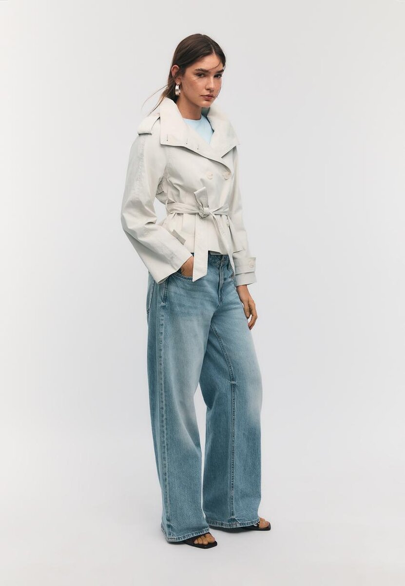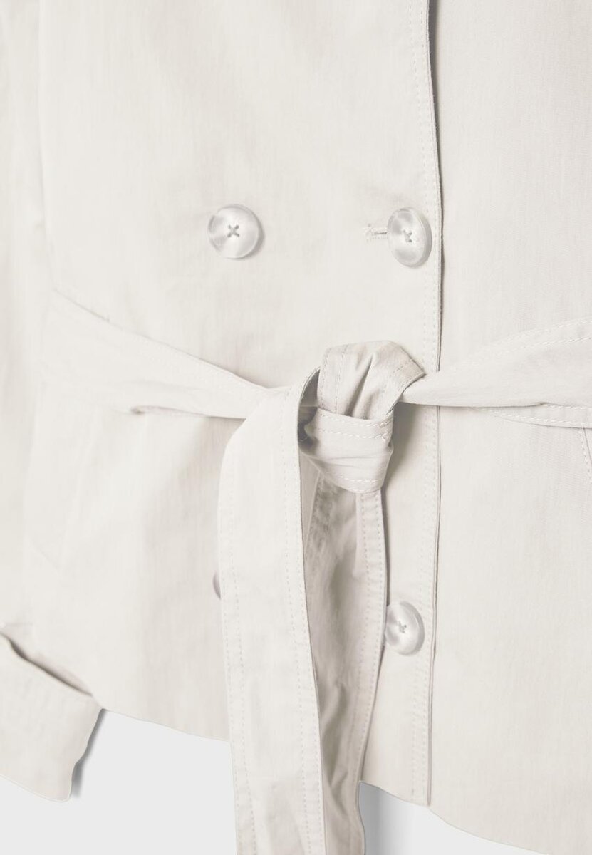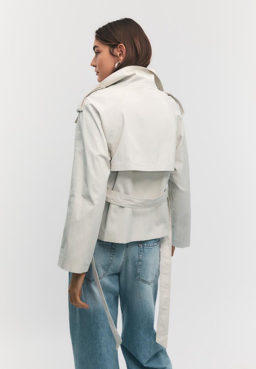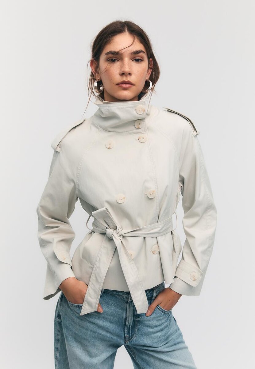 Trench-coat court à col montant et manches longues avec pattes boutonnées. Doté de poches latérales, d’une fermeture à double boutonnage sur le devant et d’une ceinture assortie. Disponible en plusieurs couleurs.