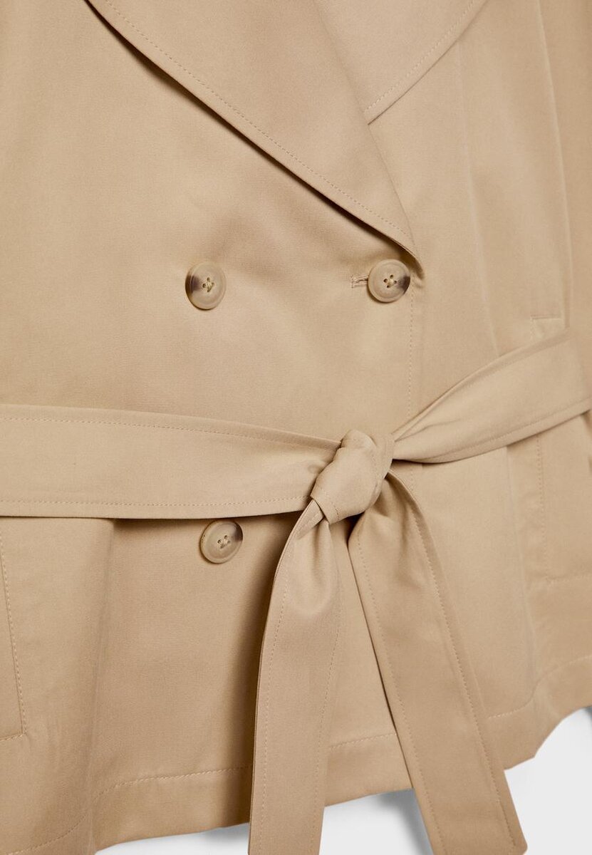 Trench court fluide avec col à revers et manches longues à pattes boutonnées. Poches latérales et fermeture à boutons croisée sur le devant. Disponible en plusieurs couleurs.