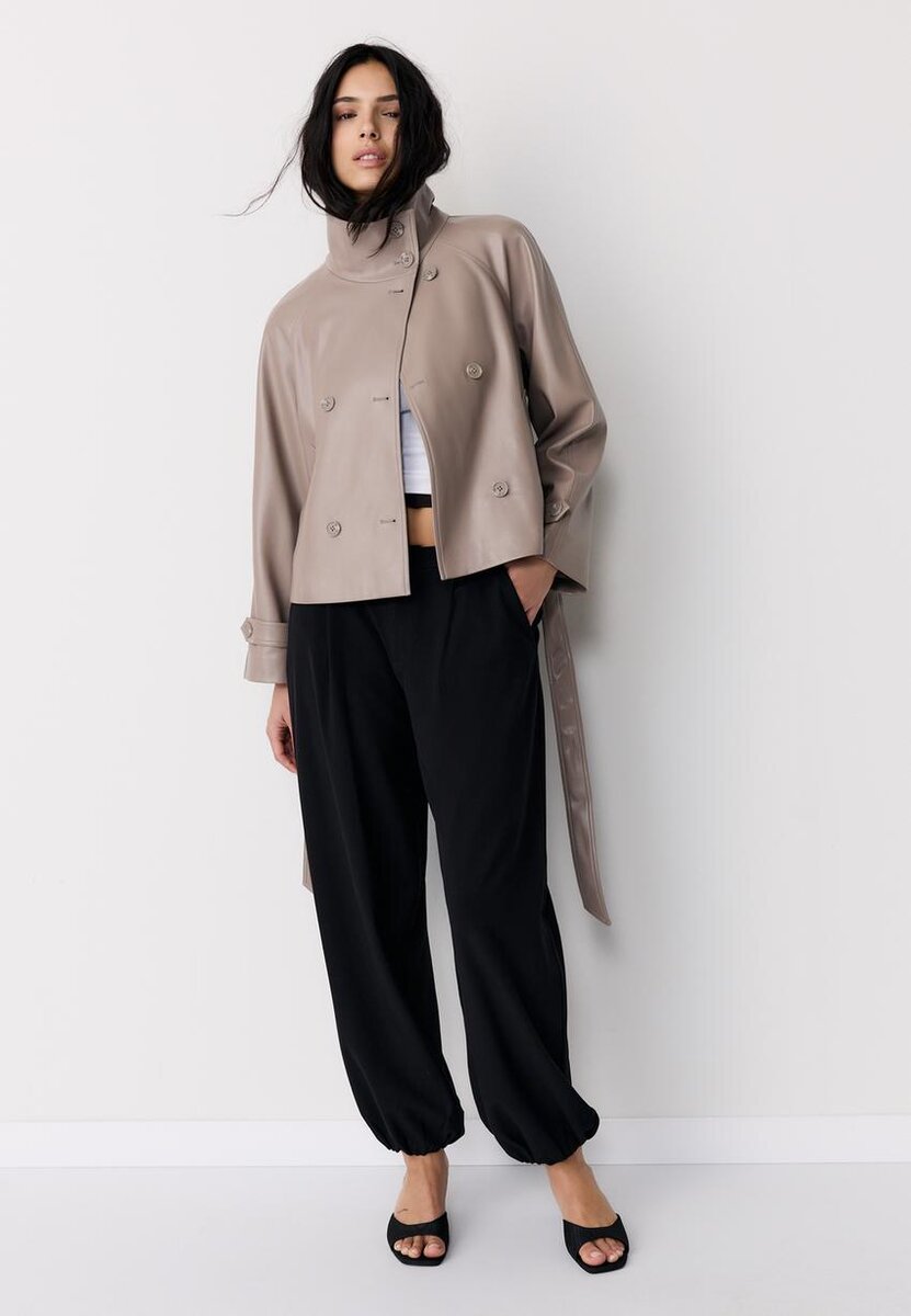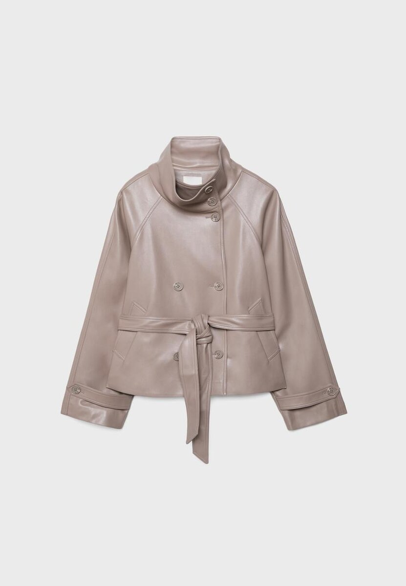 Manteau court effet cuir. Col montant et manches longues avec pattes et boutons. Poches latérales. Fermeture à double boutonnage sur le devant avec ceinture assortie. Disponible dans une gamme de couleurs.