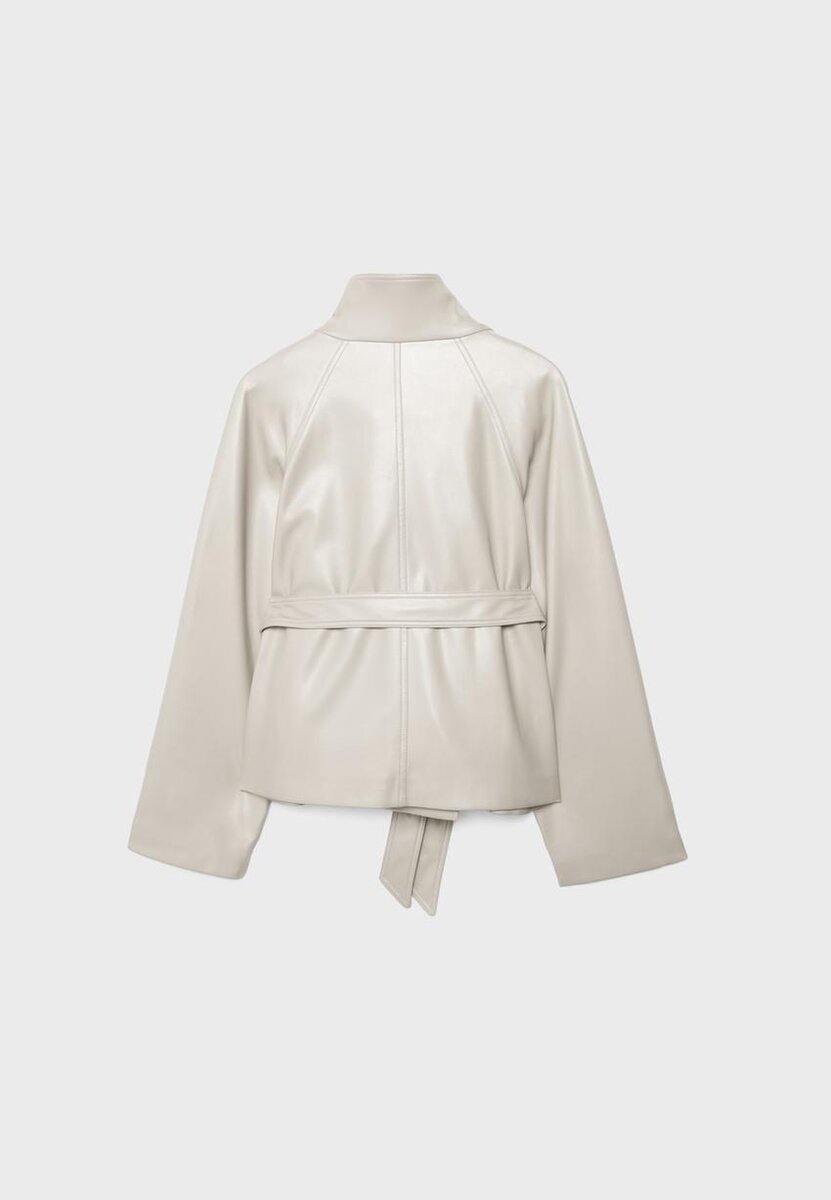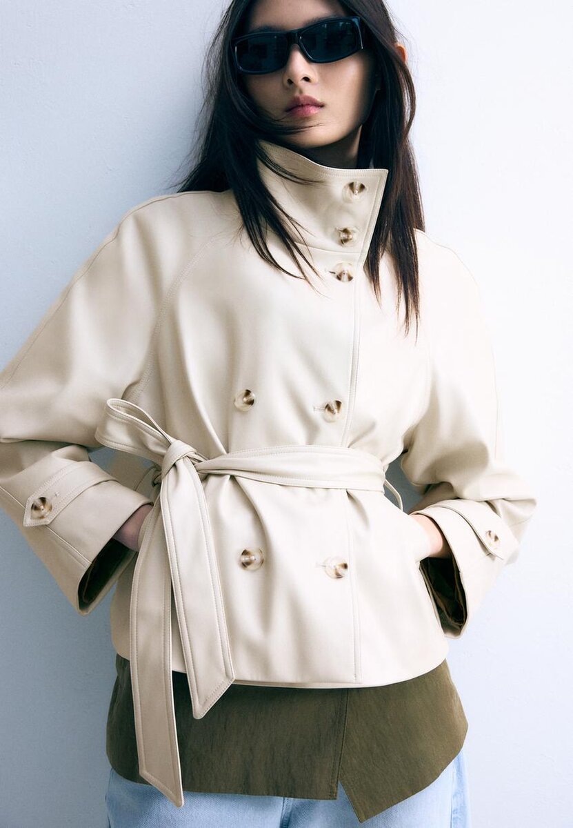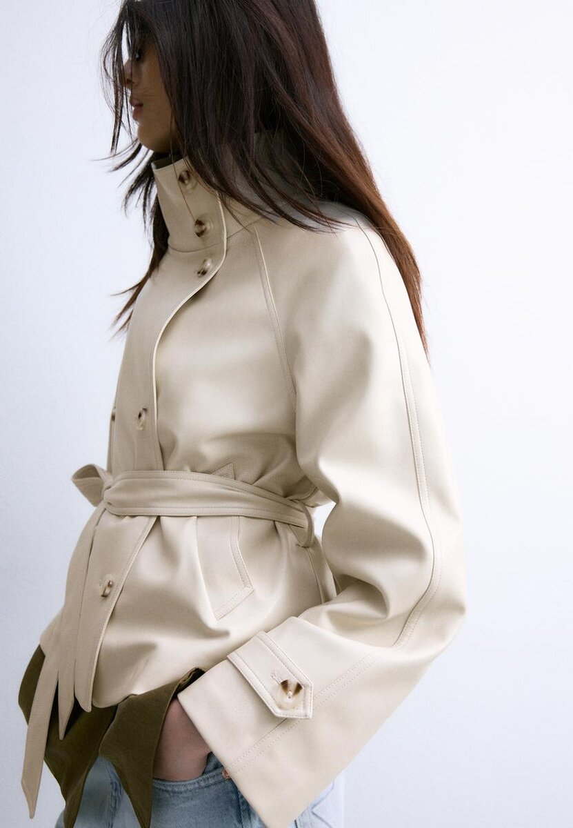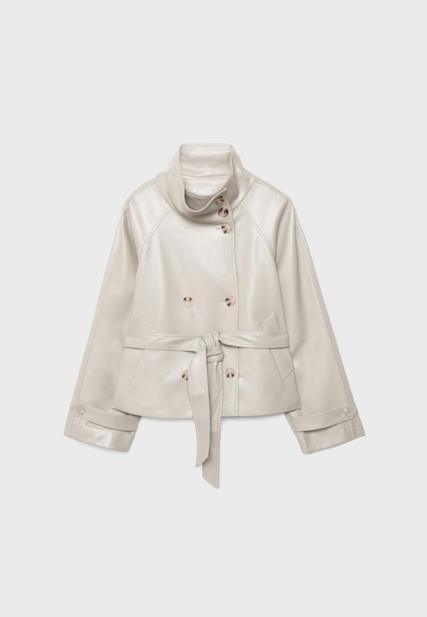 Trench-coat court effet cuir. Col montant et manches longues avec patte et bouton. Poches latérales. Fermeture à double boutonnage et ceinture assortie.