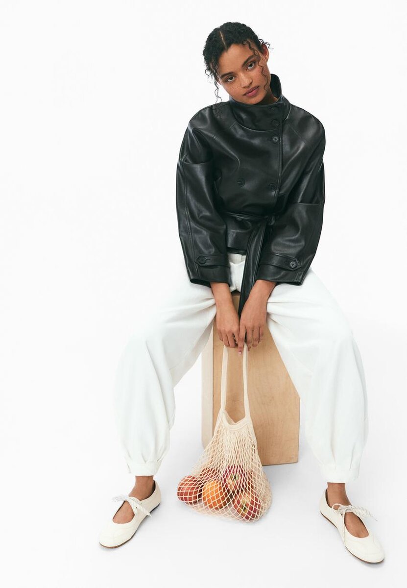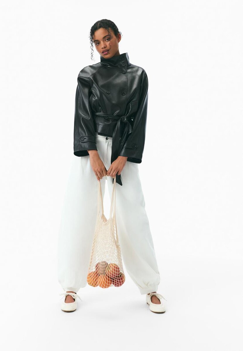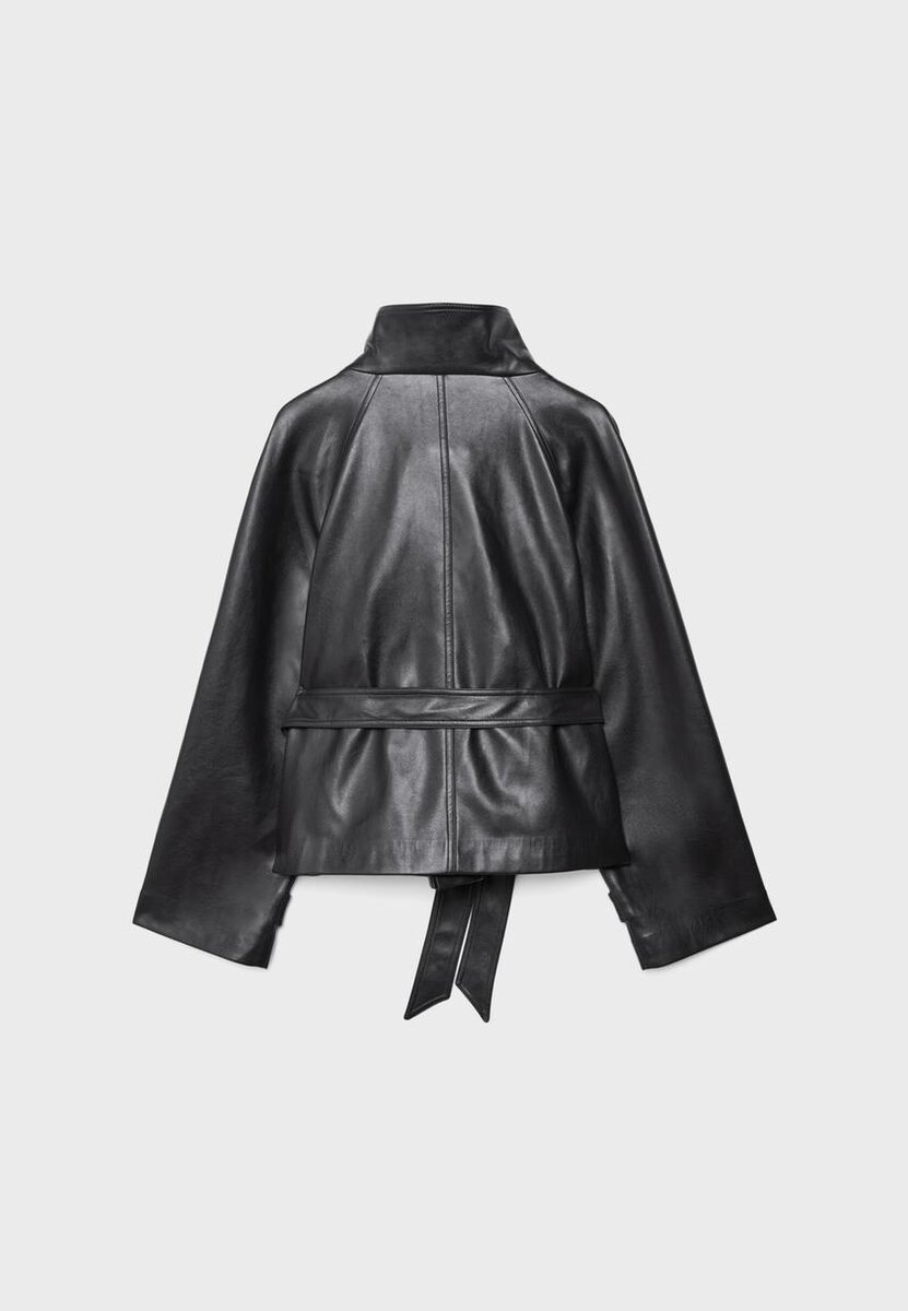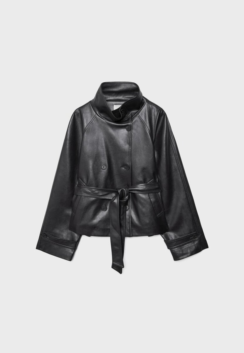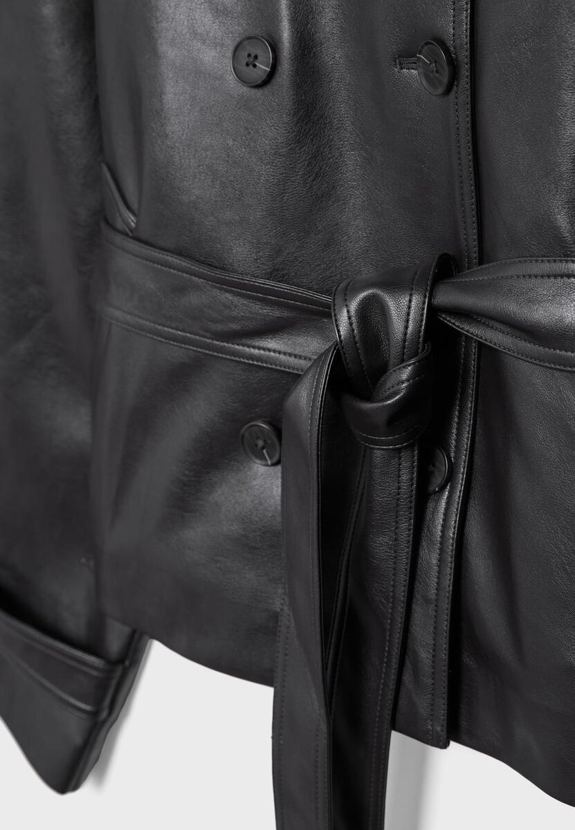 Manteau court effet cuir. Col montant et manches longues avec patte et bouton. Poches latérales. Fermeture à double boutonnage et ceinture assortie. Disponible dans une gamme de couleurs.