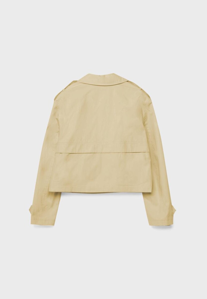 Manteau de Trench court à col à revers et manches longues avec patte et bouton. Poches latérales. Fermeture à boutons croisés. Disponible en plusieurs couleurs.