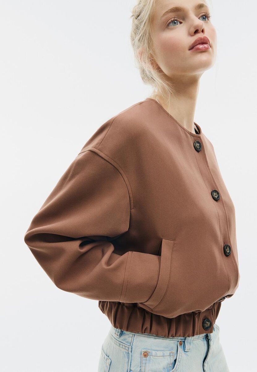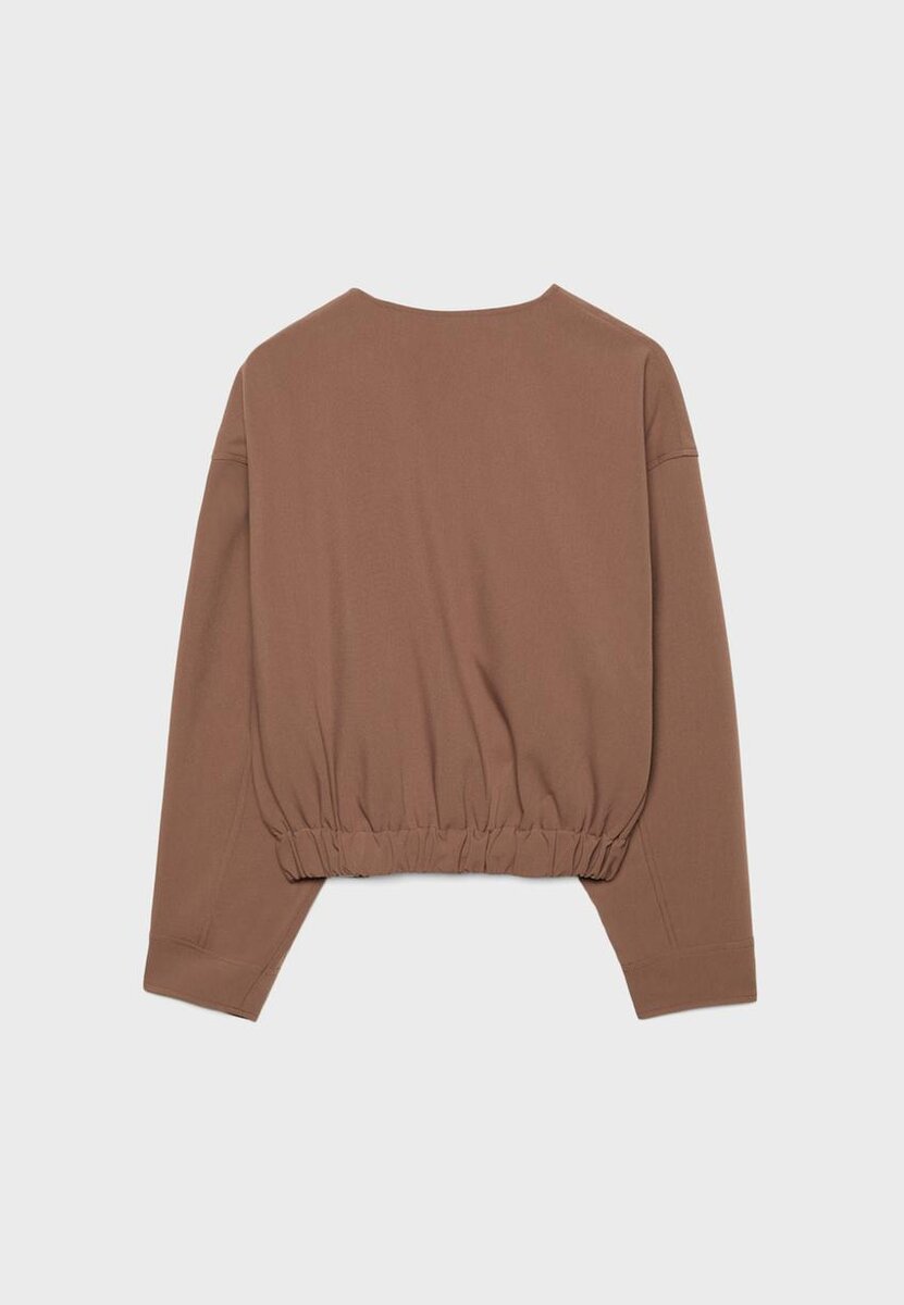 Veste à col rond et manches longues. Dotée de poches passepoilées sur le devant, d’un ourlet élastiqué et d’une fermeture à boutons sur le devant.
