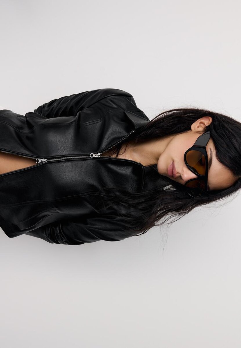Veste ajustée effet cuir avec col à revers et manches longues. Poches passepoilées sur le devant. Fermeture à glissière métallique sur le devant.