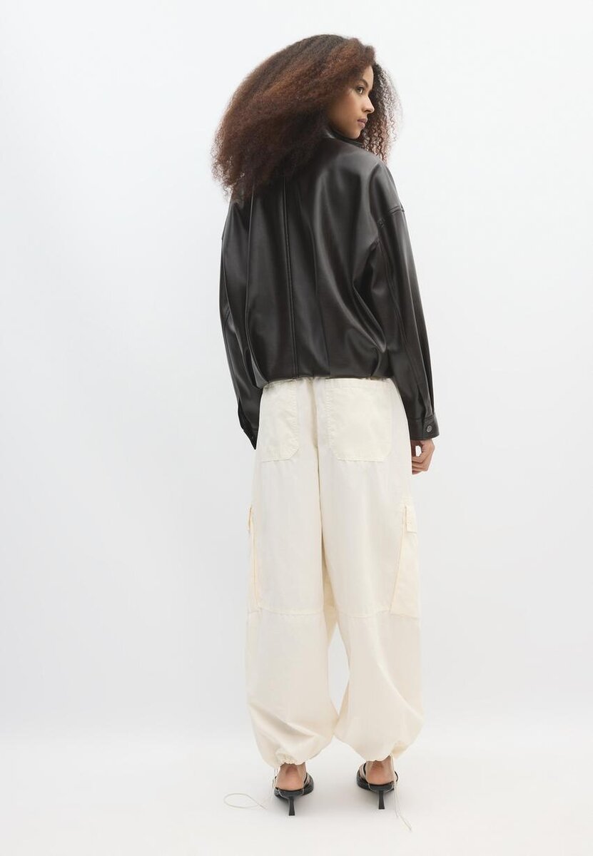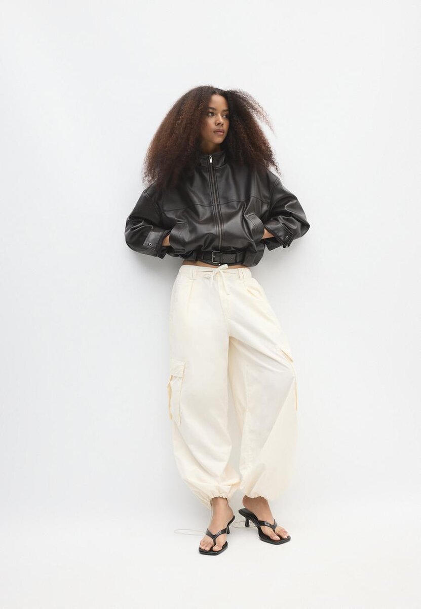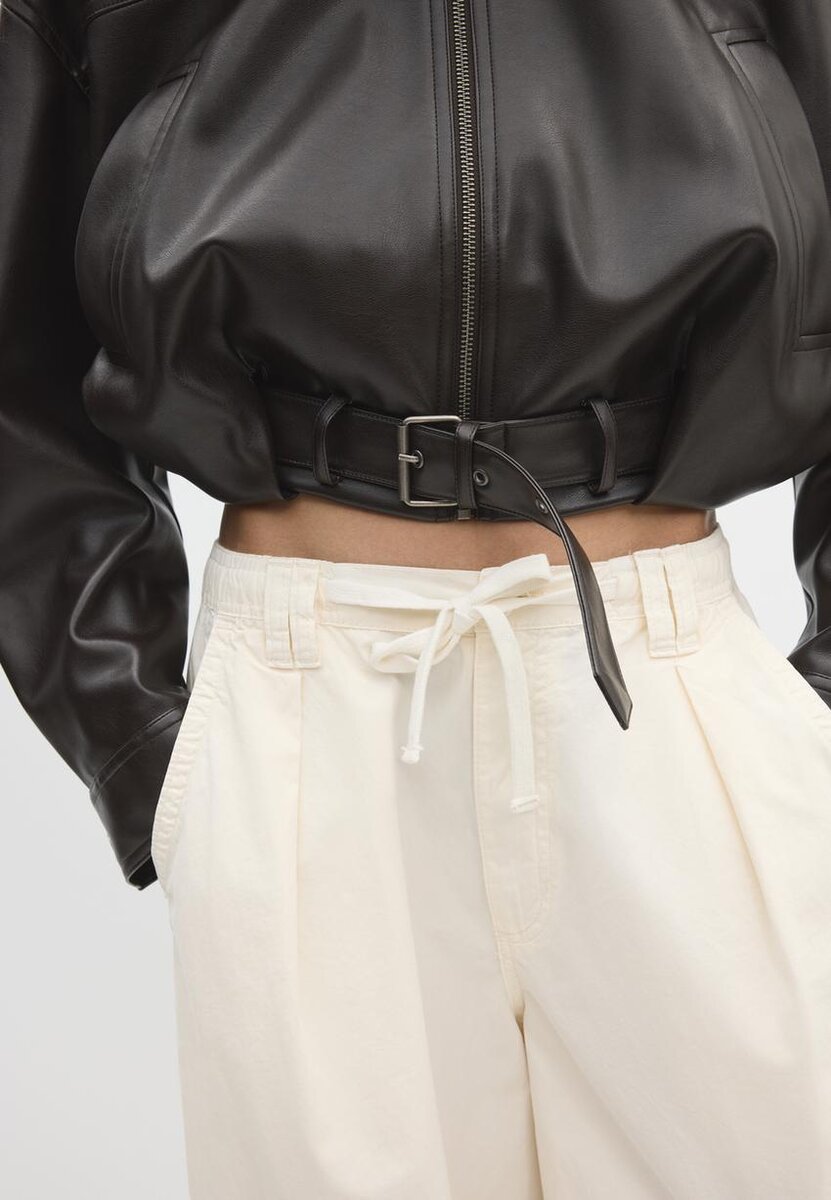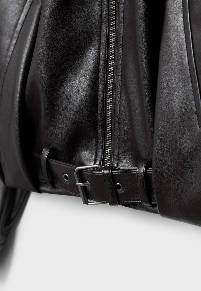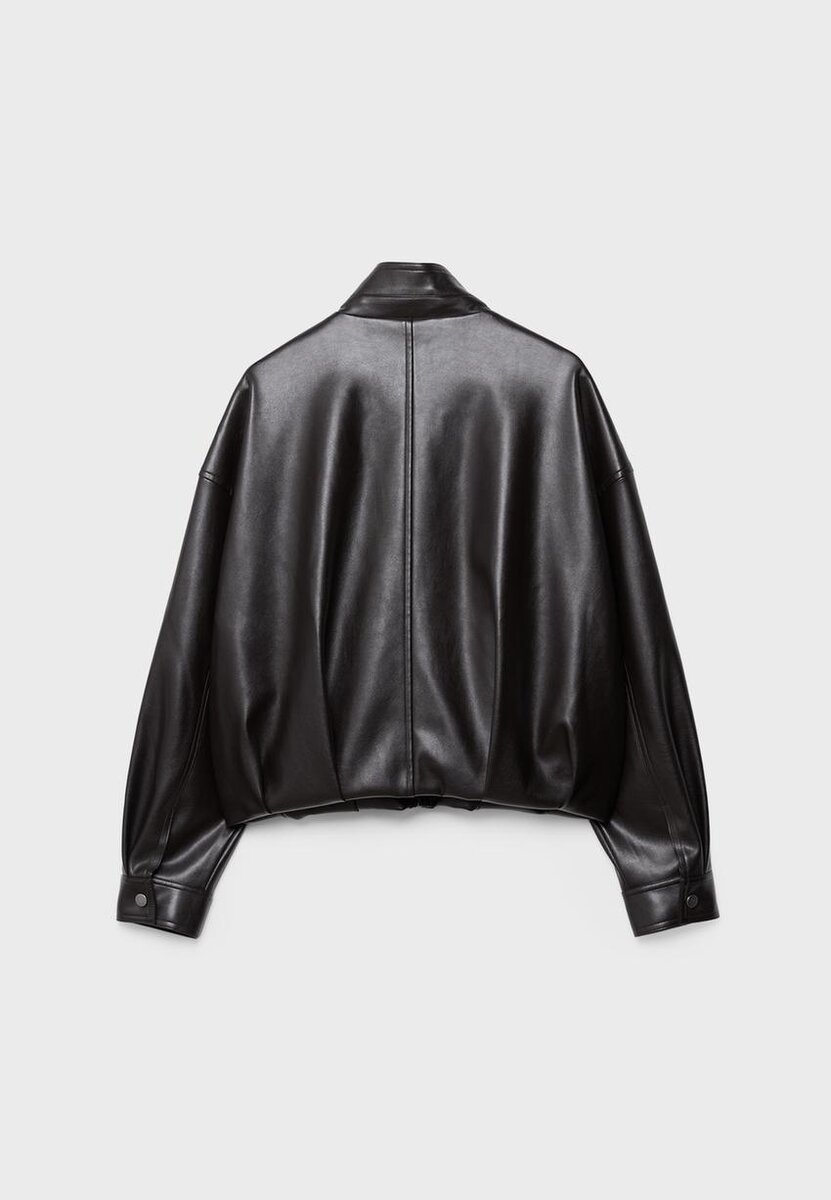 Veste confectionnée dans un tissu effet cuir ballon, avec un col montant. Manches longues et ourlet bouffant. Poches passepoilées sur le devant. Fermeture à glissière sur le devant. Ceinture assortie.
