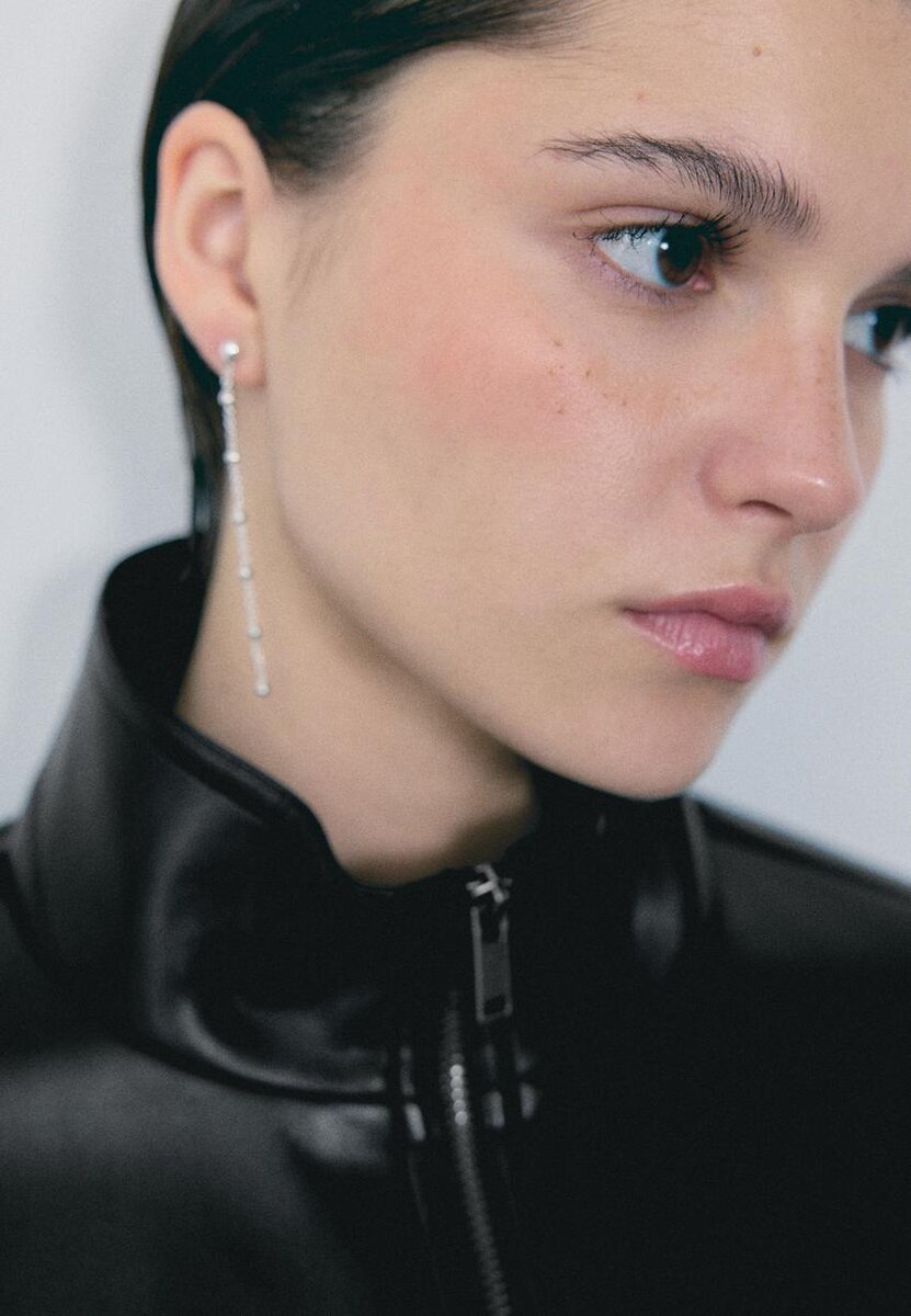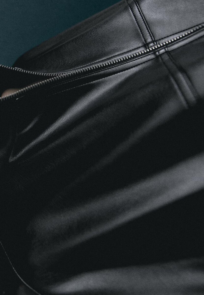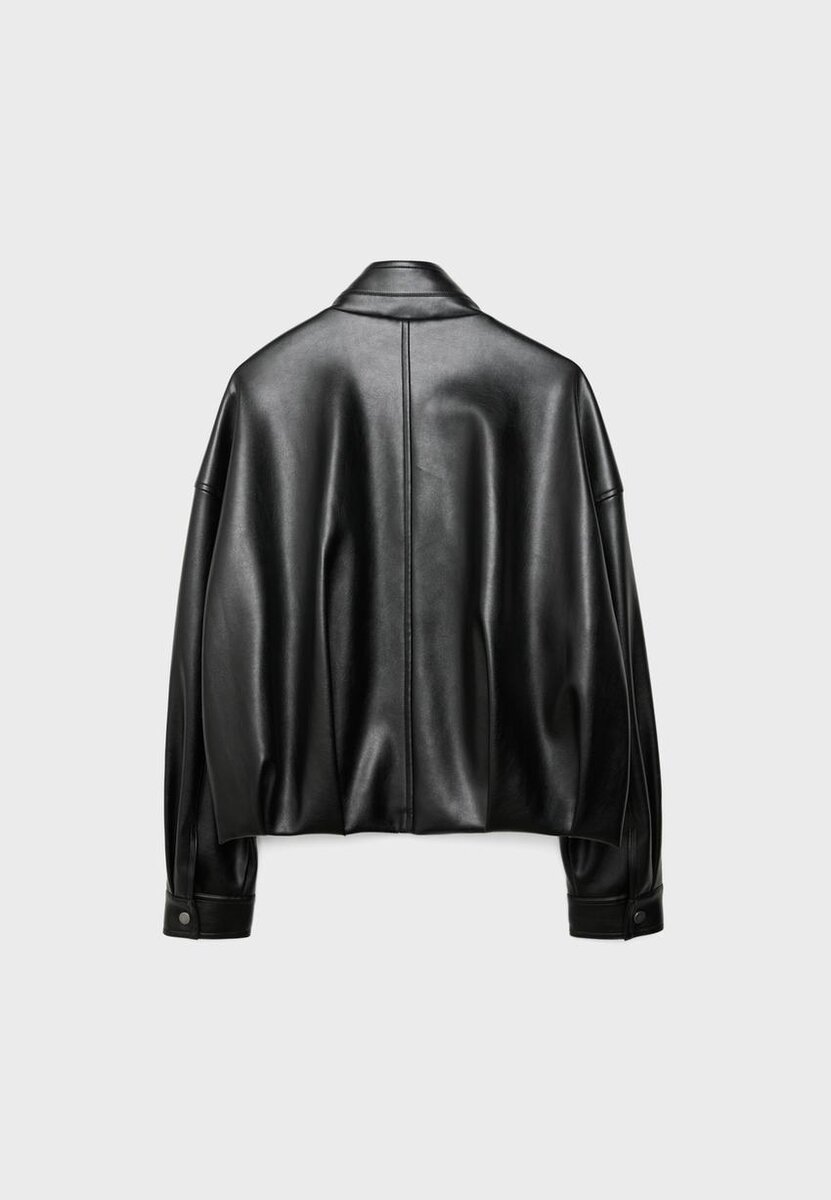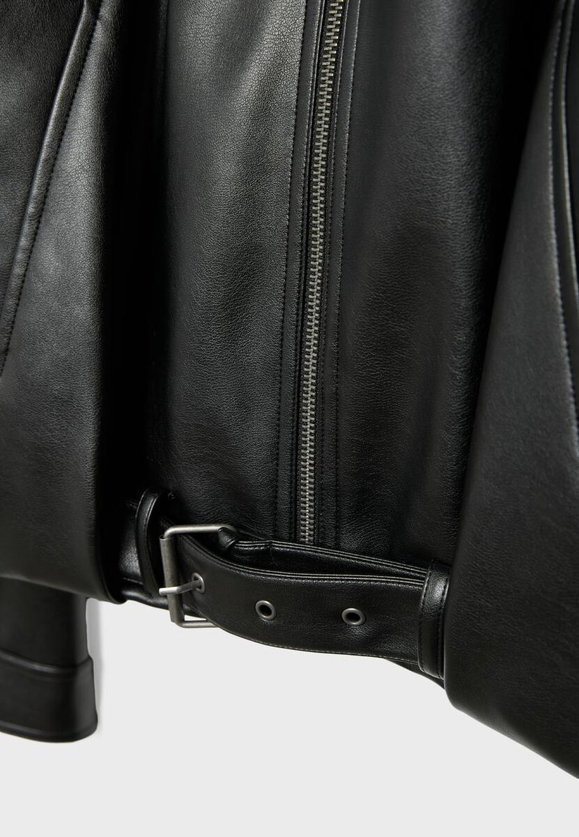 Veste ballon en tissu effet cuir à col montant. Manches longues et ourlet bouffant. Poches passepoilées sur le devant. Fermeture à glissière sur le devant. Livrée avec une ceinture assortie.