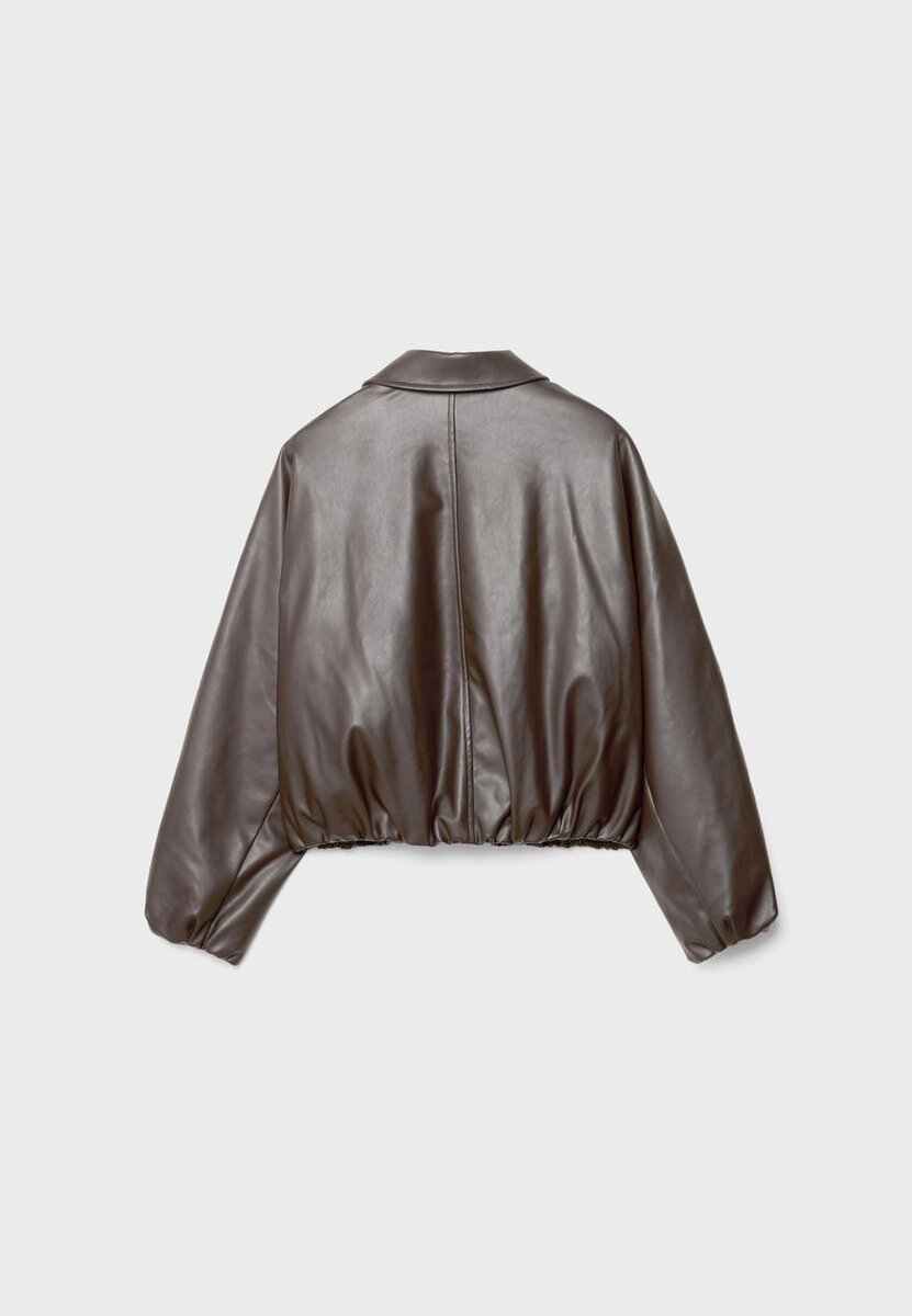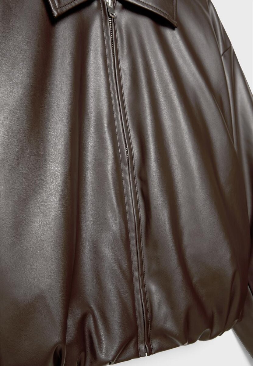 Veste aviateur matelassée en tissu effet cuir. Col à revers et manches longues avec poignets élastiqués. Poches latérales. Ourlet bouffant avec élastique. Fermeture à l’avant par une fermeture éclair métallique.