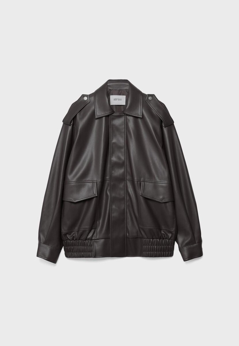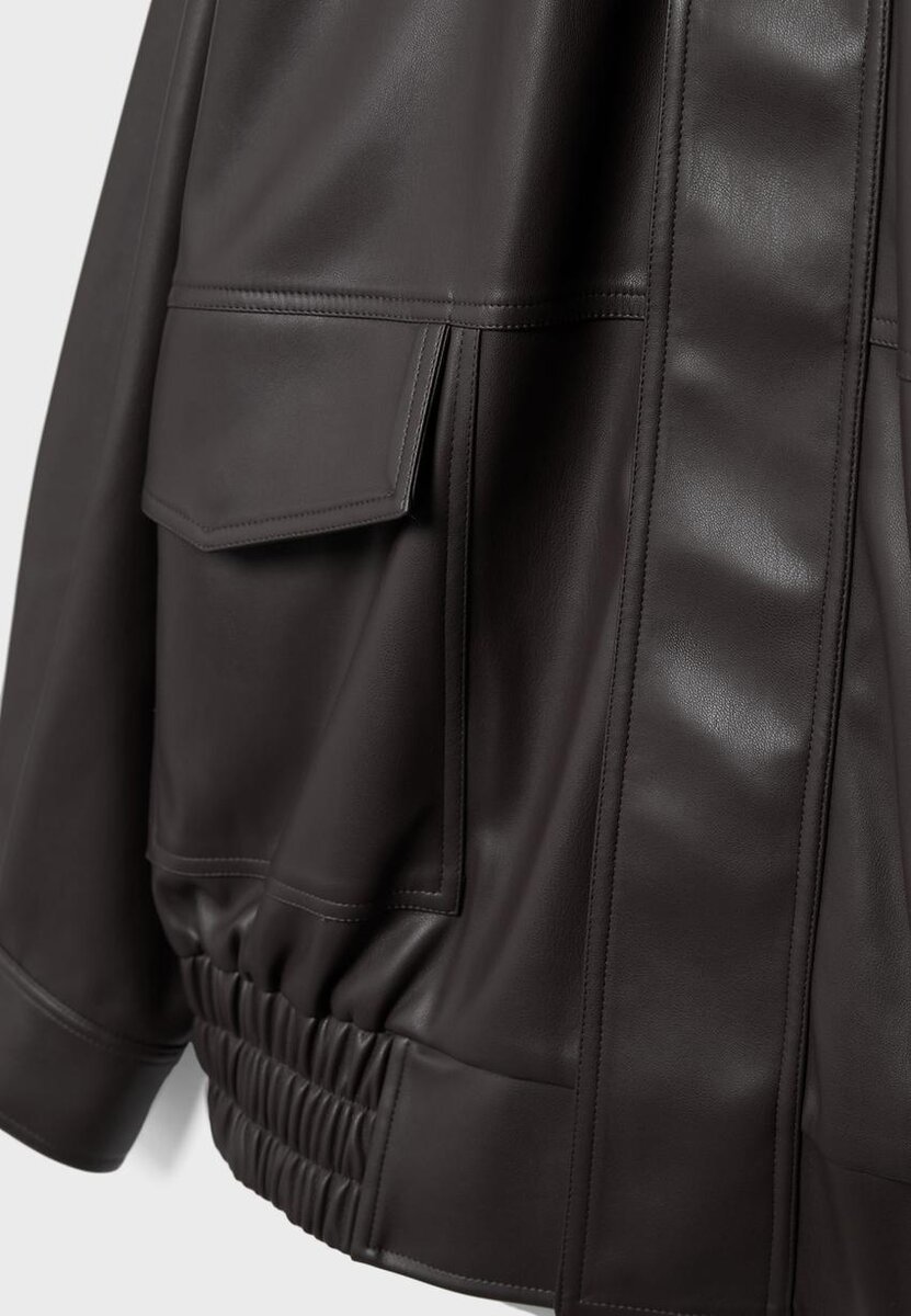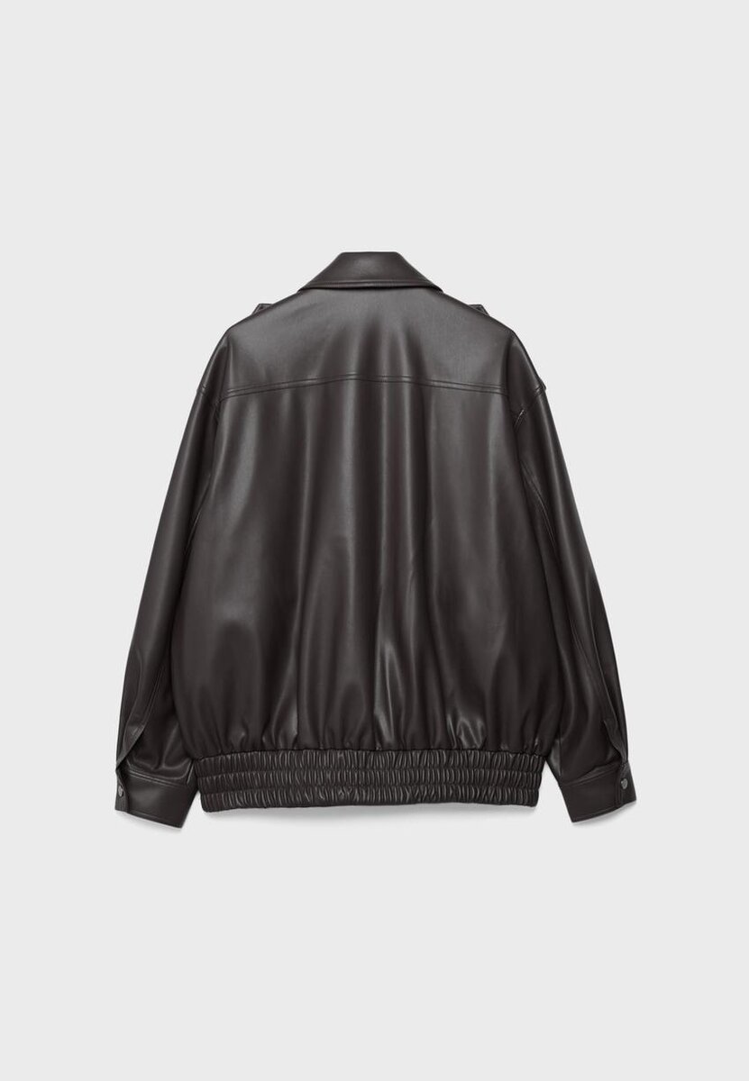 Veste oversize effet cuir. Col à revers et manches longues avec poignets à boutons-pression. Fermeture avant à glissière dissimulée sous un rabat. Poches plaquées sur le devant avec rabat et fermeture à boutons-pression. Détail de patte d’épaule. Disponible en plusieurs couleurs.