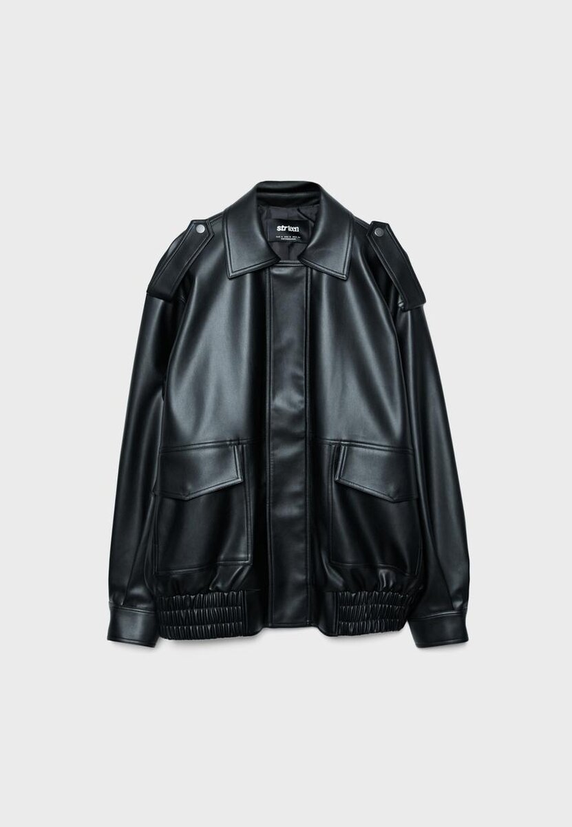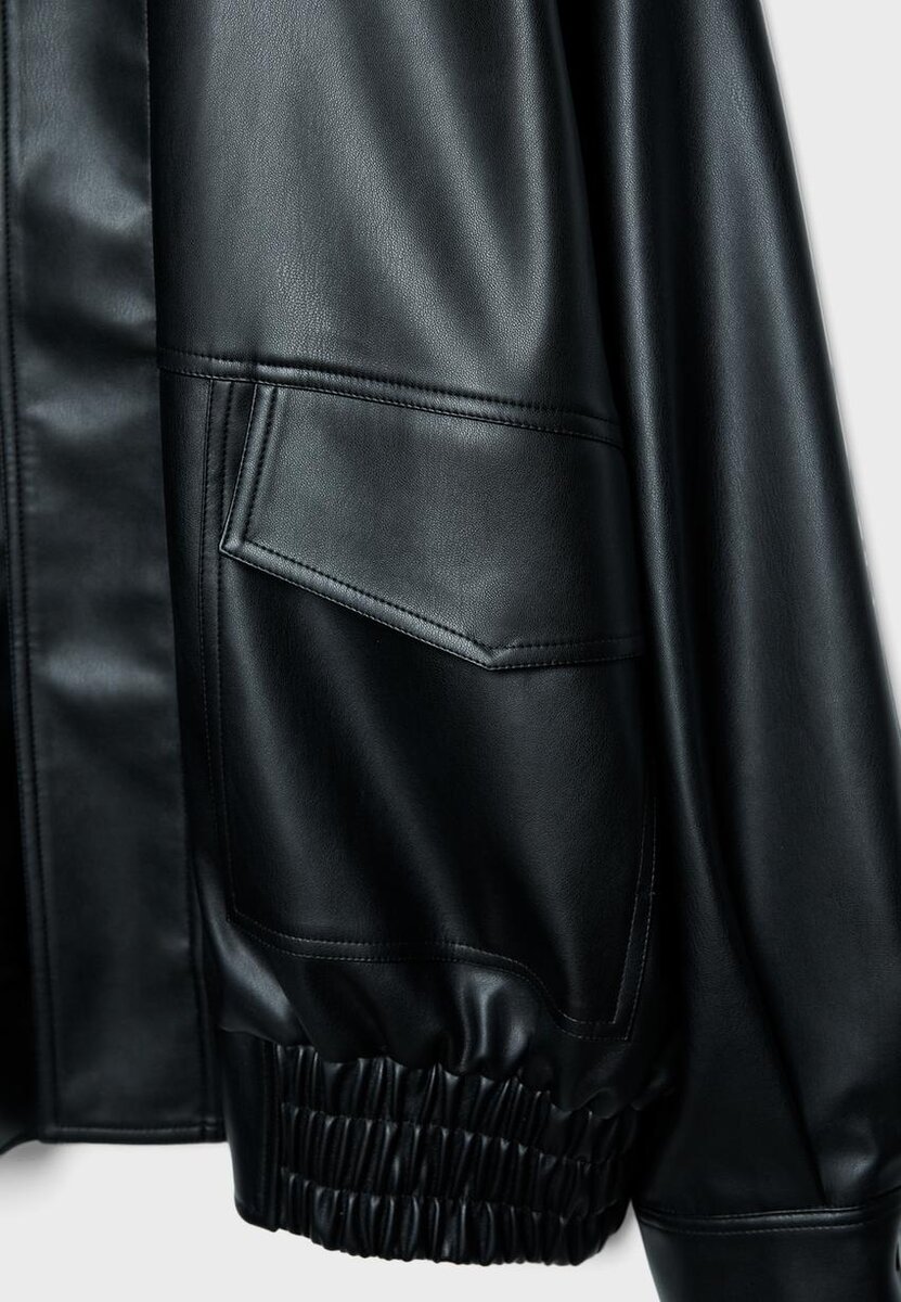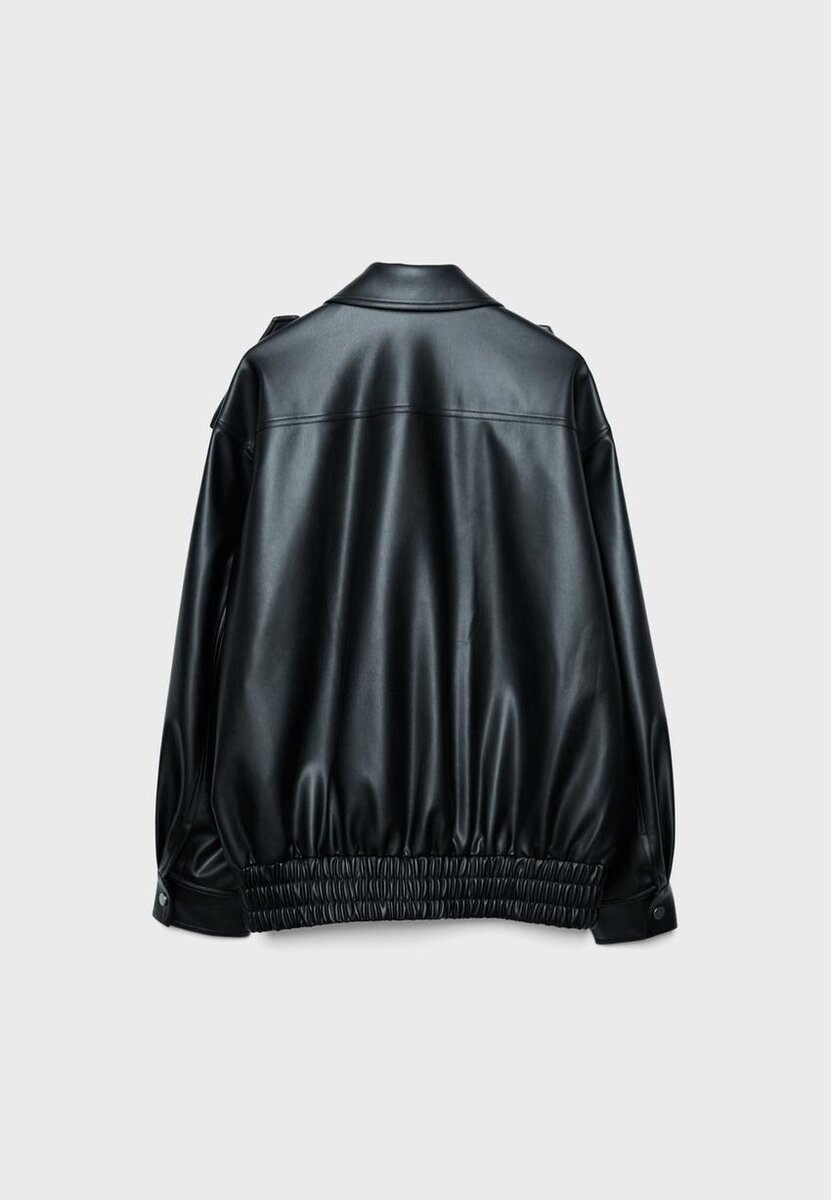 Veste oversize effet cuir. Col à revers et manches longues avec poignets à boutons-pression. Fermeture avant à glissière dissimulée sous un rabat. Poches plaquées sur le devant avec rabat et fermeture à boutons-pression. Détails de pattes aux épaules. Disponible en plusieurs couleurs.