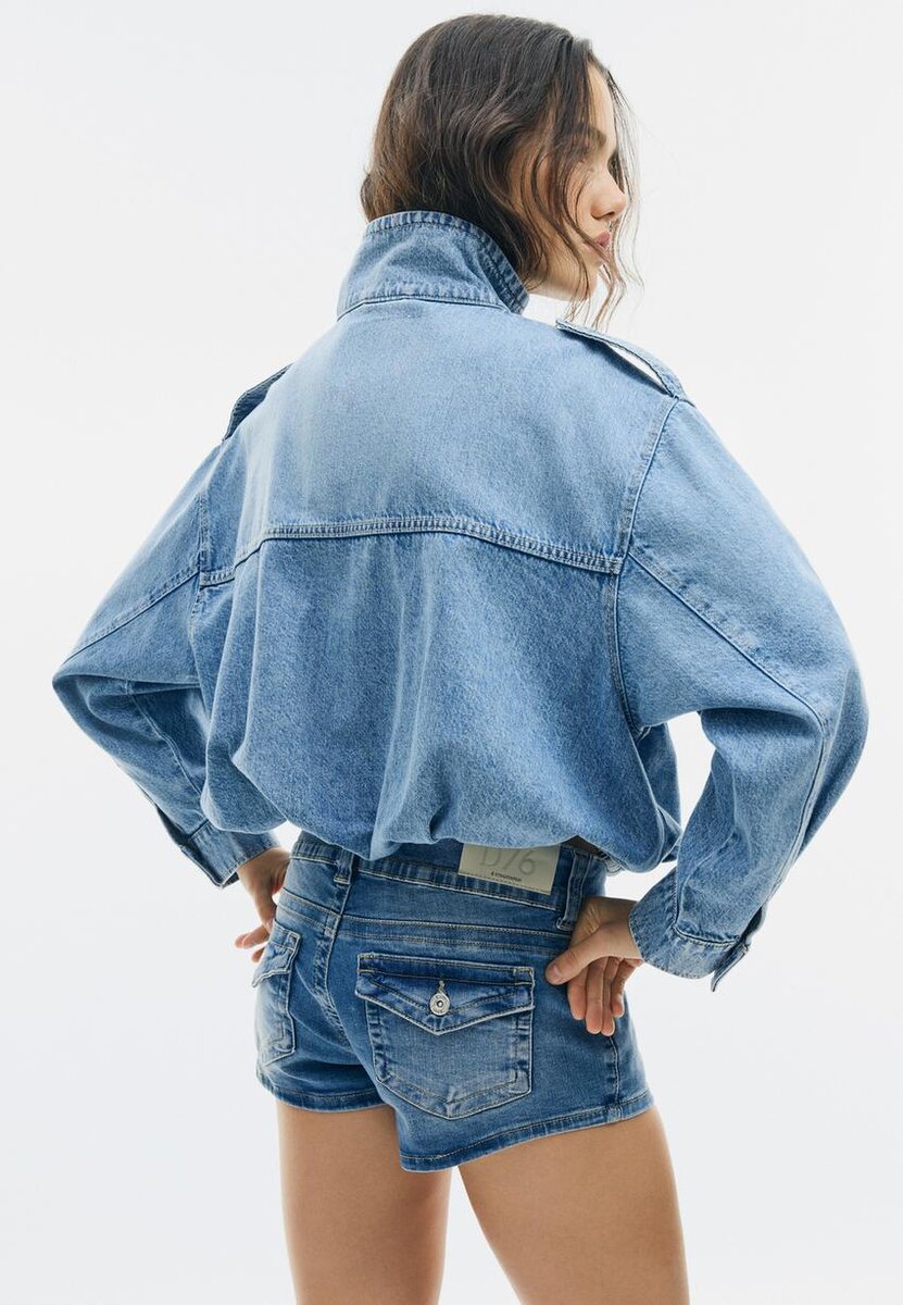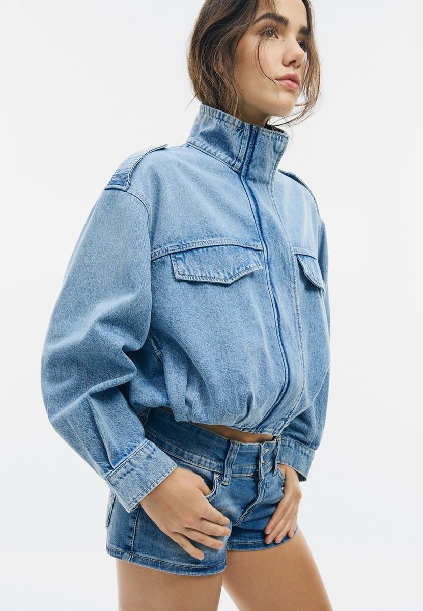 Veste en denim Balloon Fit avec col montant et manches longues à revers. Dotée de poches latérales, d’une fermeture à glissière dissimulée sous un rabat et de détails à pattes sur les épaules.
