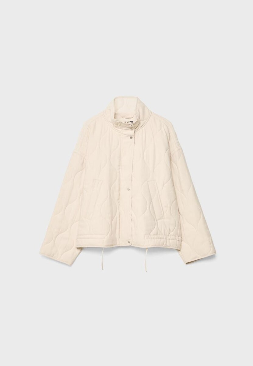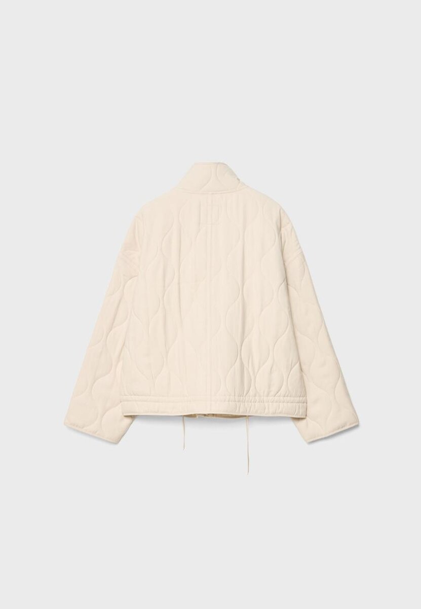 Veste matelassée à col montant et manches longues. Poches passepoilées sur le devant. Ourlet ajustable avec cordons de serrage. Fermeture à glissière sur le devant dissimulée par une patte de boutonnage et des boutons-pression. Disponible en plusieurs couleurs.