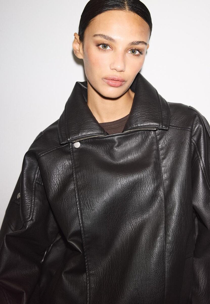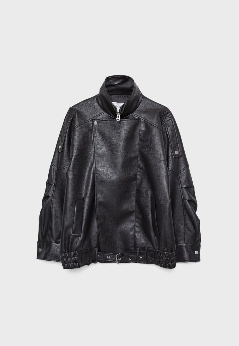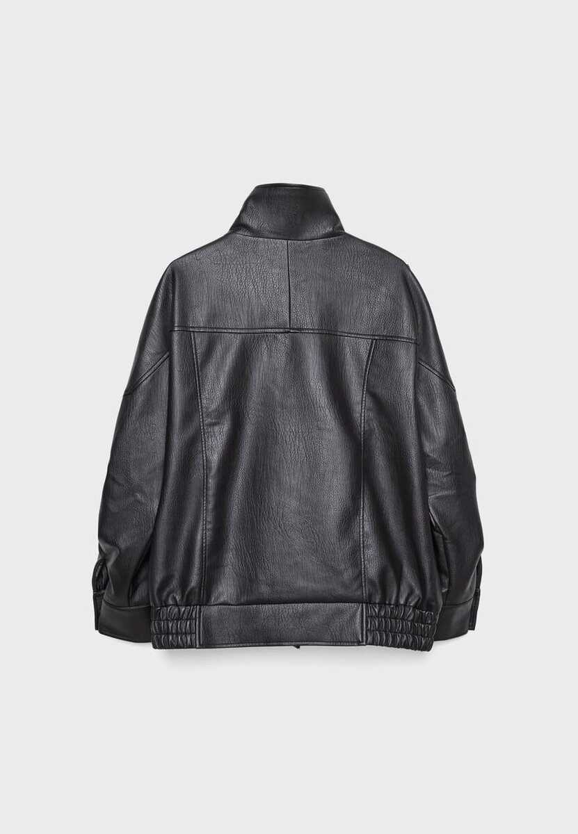 Veste oversize en tissu effet cuir à col montant. Manches longues avec pattes d’épaule et poches passepoilées sur le devant. Fermeture à glissière sur le devant dissimulée par un rabat. Ourlet élastiqué avec ceinture assortie.