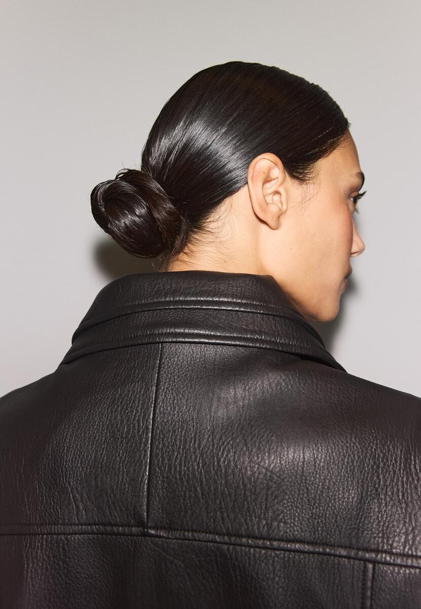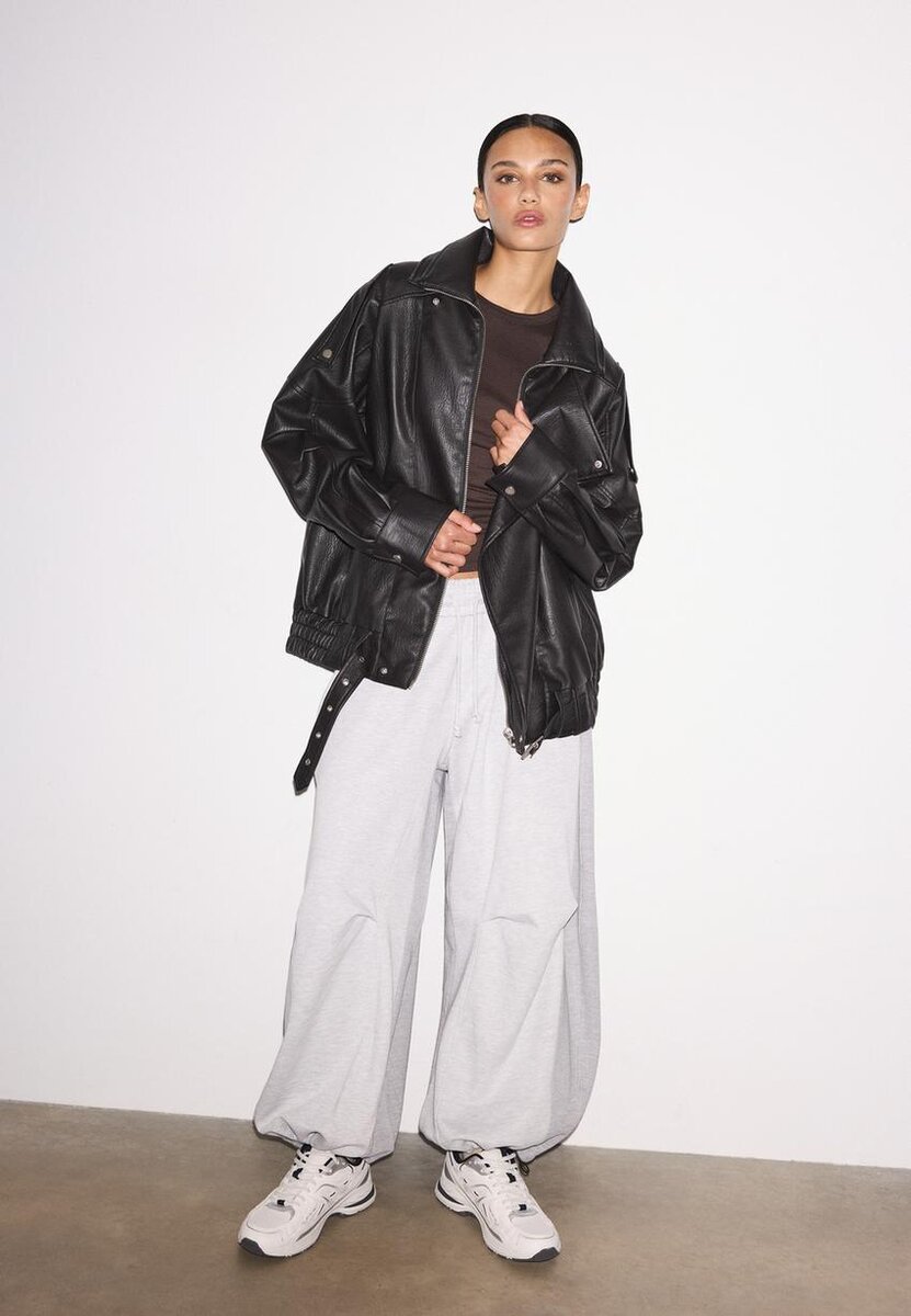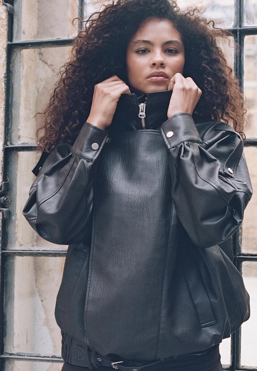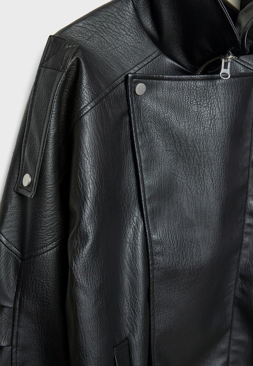 Veste oversize en tissu effet cuir à col montant. Manches longues avec pattes d’épaule et poches passepoilées sur le devant. Fermeture à glissière sur le devant dissimulée par un rabat. Ourlet élastiqué avec ceinture assortie.