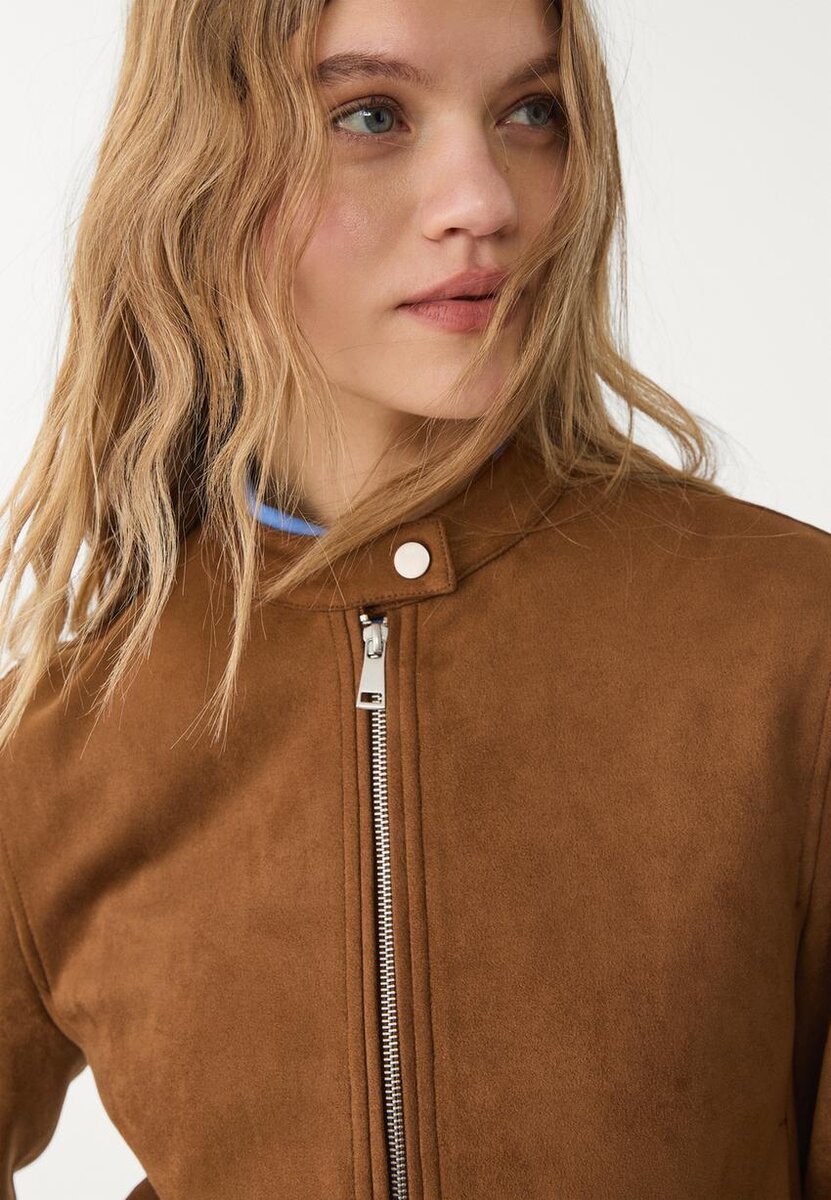 Veste ajustée en tissu simili-suède. Dotée d’un col montant avec bouton-pression et de manches longues. Se ferme sur le devant à l’aide d’une fermeture éclair en métal. Disponible en plusieurs couleurs.